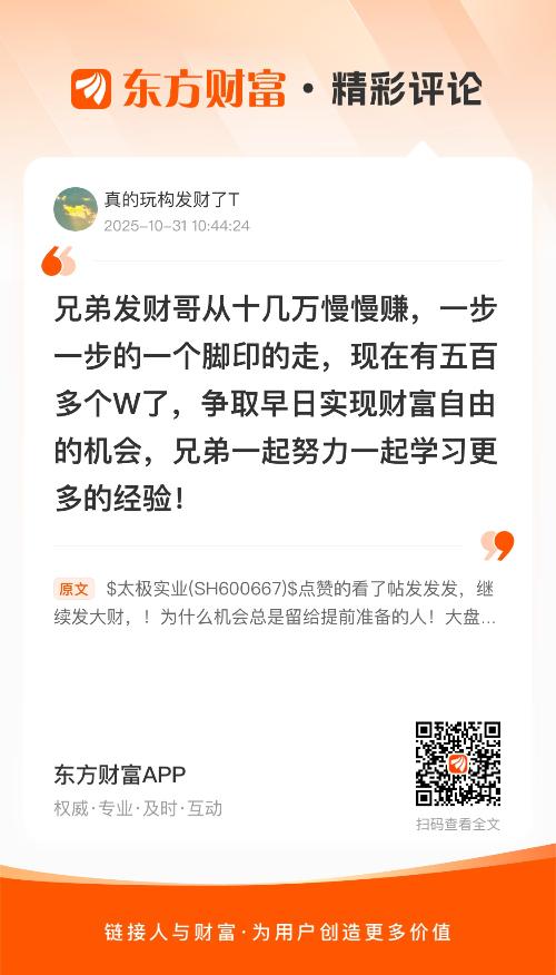 $太极实业(SH600667)$ 点赞的看了帖发发发,继续发大财,!为什么机会总是留给提前准备的人!大盘及个股为什么都比较听发财哥的!在为兄弟是认认真真看了发财哥今年的帖子都知道华哥在什么价位买了9元左右的时候就知道发财哥会8.5毛几买!今天是10月31日大方小方明年一定会跟着发财,哥早日实现财富自由的机会!