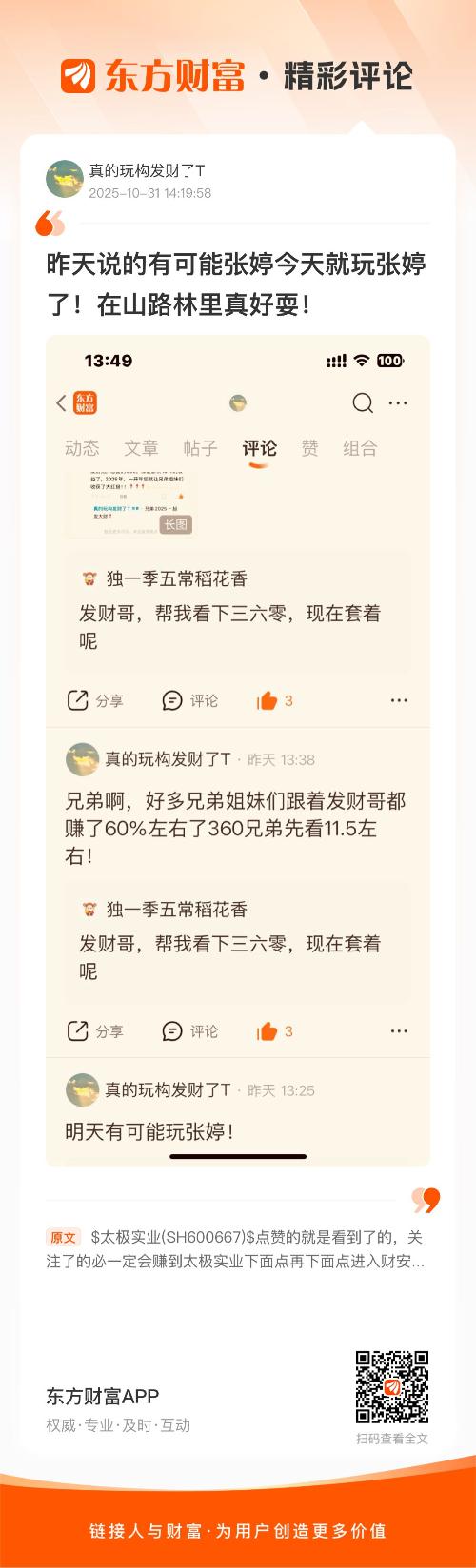 $太极实业(SH600667)$ 点赞的就是看到了的,关注了的必一定会赚到太极实业下面点再下面点进入财安宜!昨天提醒的10月30日提醒山路林里面怎么走今天又印证了提前说的对与错!