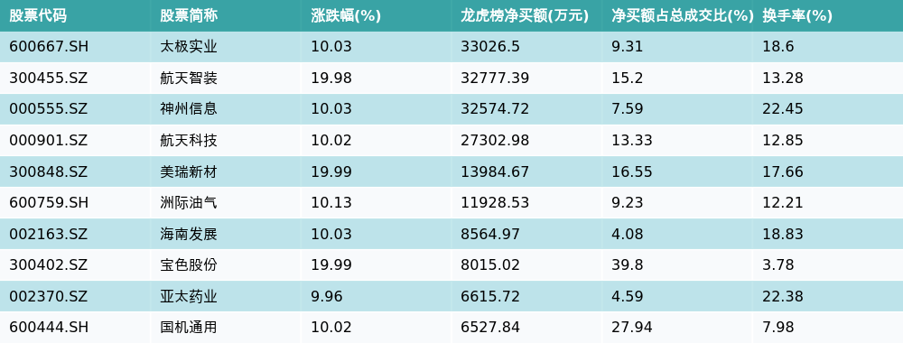 南财智讯11月3日电,南财金融终端数据显示,因当日异动登上龙虎榜的个股中,资金净买入最多的前三位分别是太极实业(600667.SH)、航天智装(300455.SZ)与神州信息(000555.SZ)。其中排名第一的太极实业净买额达3.3亿元,占总成交金额的9.31%。太极实业当日收盘上涨10.03%,换手率为18.6%,净买入额前10个股详情见下图: