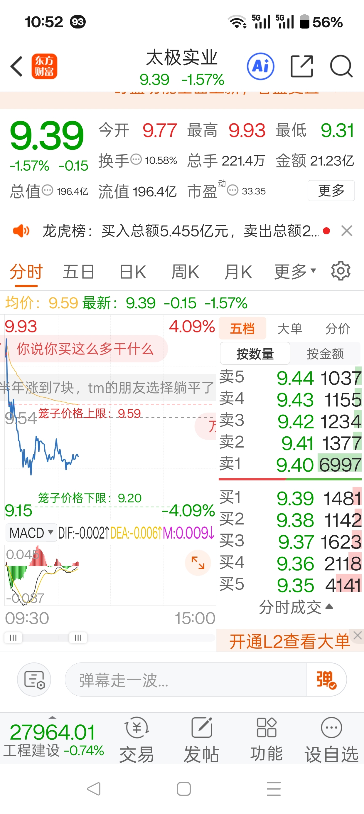 $太极实业(SH600667)$ 是不是可以买了??咱就想补个仓啊。昨天我还是判断错了,没有低开。9.20毛都没有摸到,开盘在9.77,我错了。股市真是反人性的东西,说明该股还有人性,不适合在股市了。唉,走了。