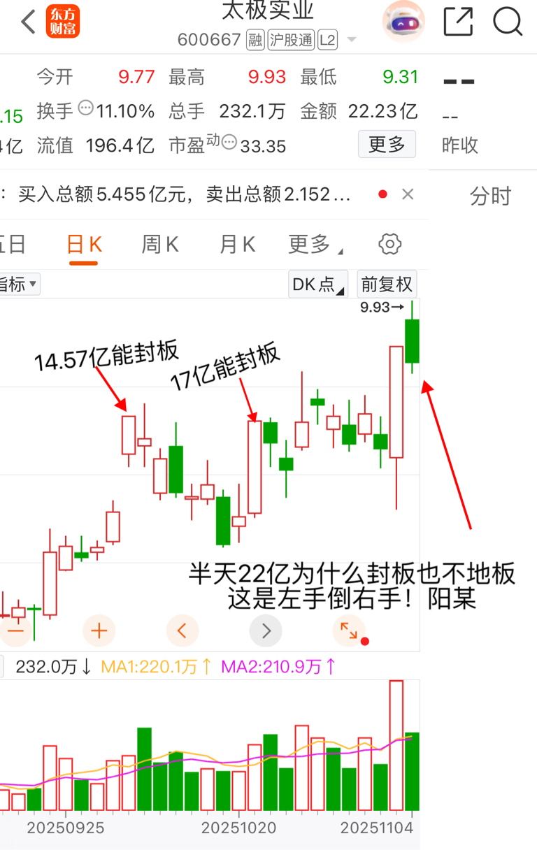 $太极实业(SH600667)$ K线透视眼!14能板、17亿能板、早盘22亿的量左手倒右手,刻意压着弹簧;#强势机会#