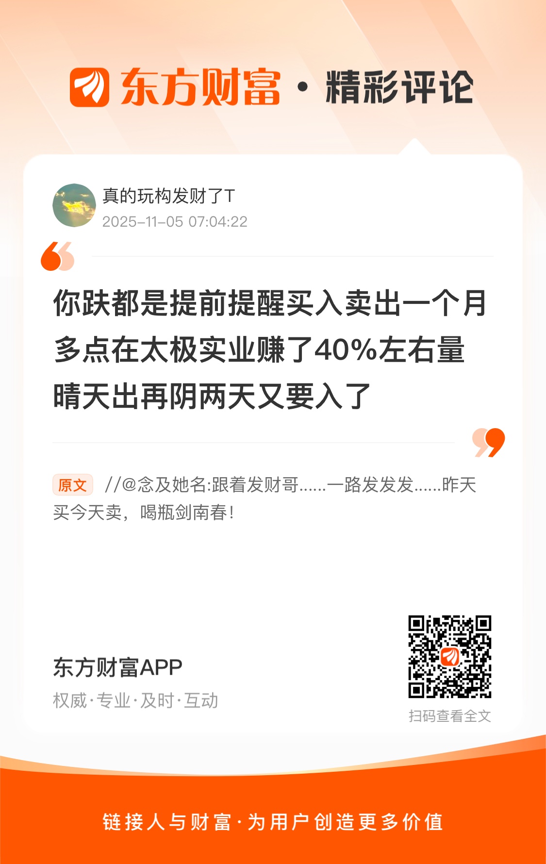 //@真的玩构发财了T : 回复 股瀚宇 :你趺都是提前提醒买入卖出一个月多点在太极实业赚了40%左右量晴天出再阴两天又要入了