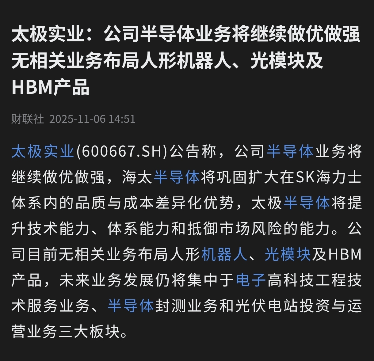 $太极实业(SH600667)$ 太极实业(600667.SH)公告称,公司半导体业务将继续做优做强,海太半导体将巩固扩大在SK海力士体系内的品质与成本差异化优势,太极半导体将提升技术能力、体系能力和抵御市场风险的能力。公司目前无相关业务布局人形机器人、光模块及HBM产品,未来业务发展仍将集中于电子高科技工程技术服务业务、半导体封测业务和光伏电站投资与运营业务三大板块。