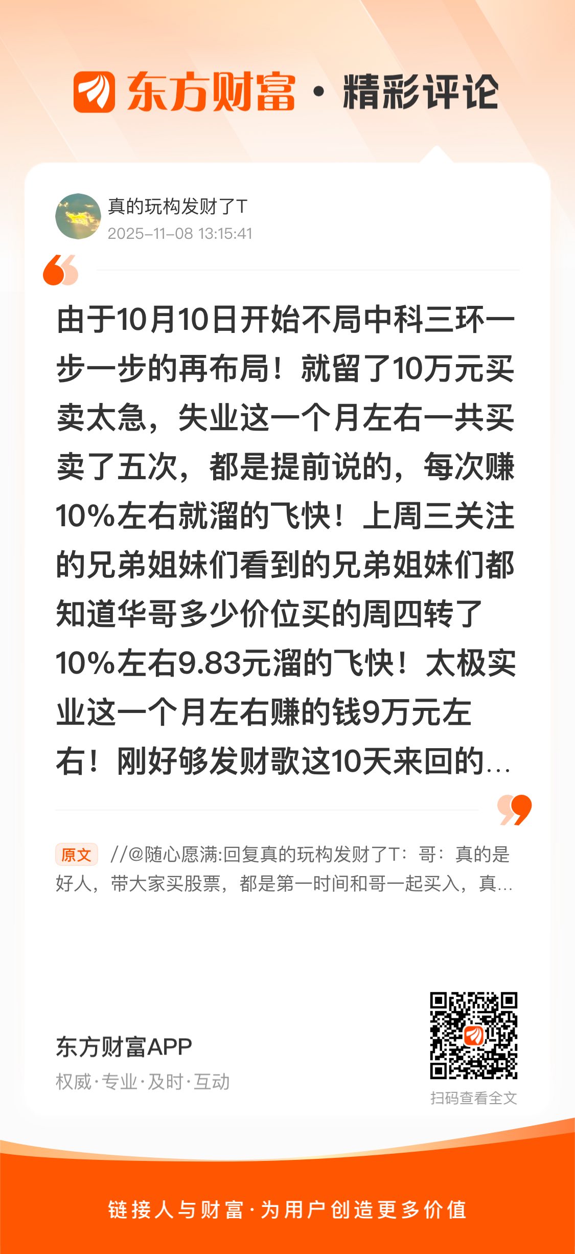 由于10月10日开始不局中科三环一步一步的再布局!就留了10万元买卖太急失业这一个月左右一共买卖了五次,都是提前说的,每次赚10%左右就溜的飞快!上周三关注的兄弟姐妹们看到的兄弟姐妹们都知道华哥多少价位买的周四转了10%左右9.83元溜的飞快!太极实业这一个月左右赚的钱9万元左右!刚好够发财歌这10天来回的头等舱机票和做五星级酒店吃住到处玩的费用!等10号过后回到家后又要天天买卖股票了!争取春节前带着关注的兄弟姐妹们领个春节大红包!