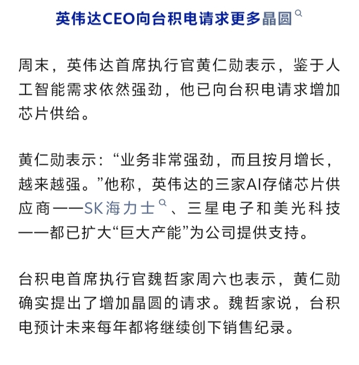 英伟达CEO向台积电请求更多晶圆周末,英伟达首席执行官黄仁勋表示,鉴于人工智能需