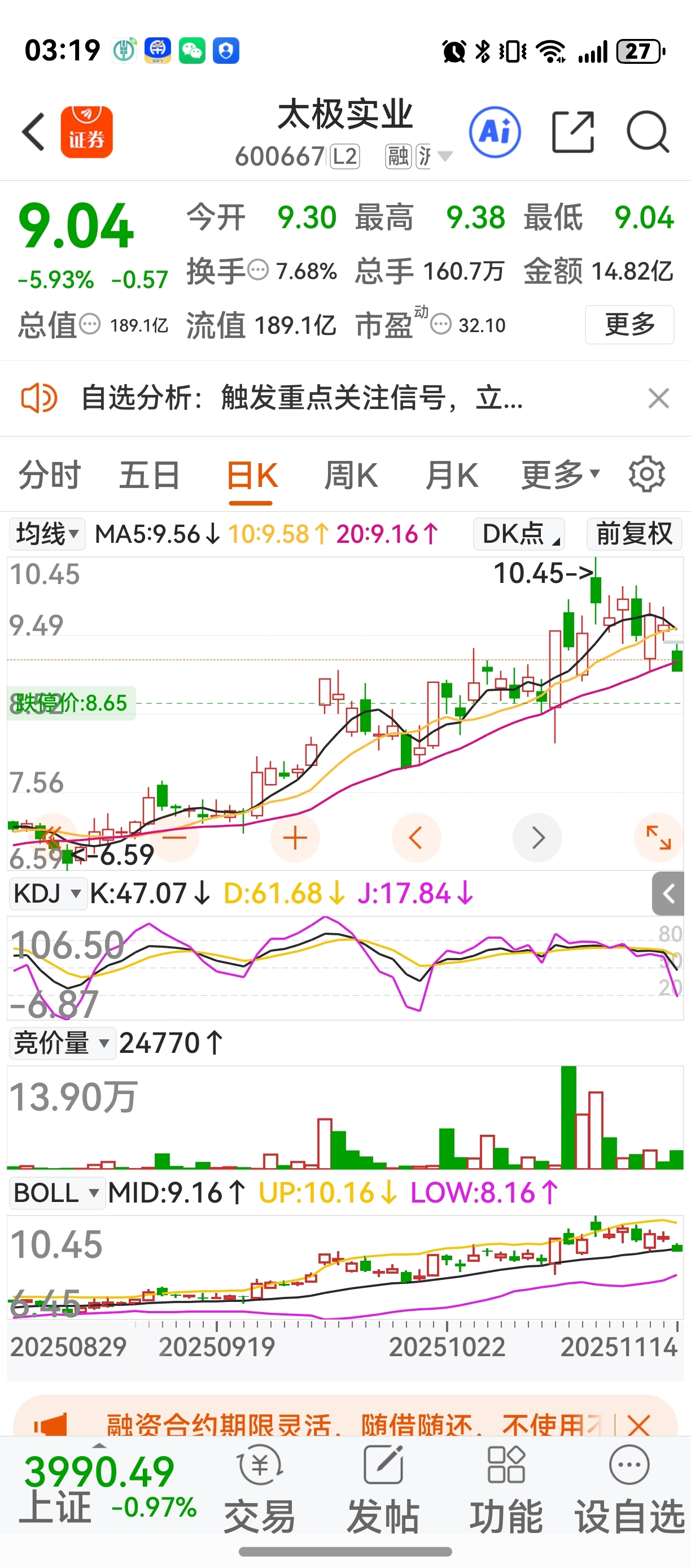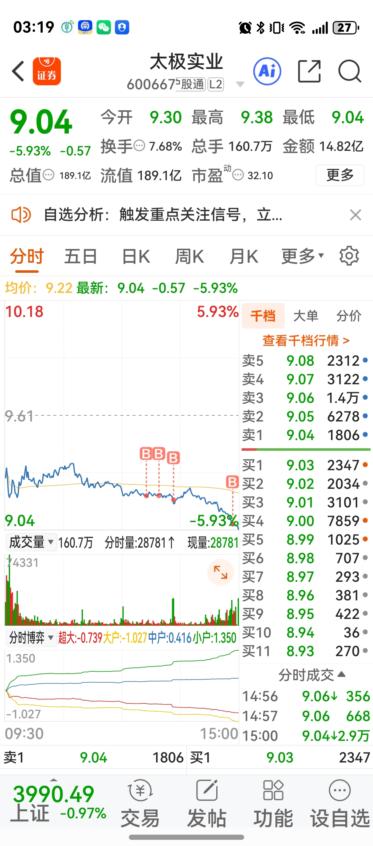 $太极实业(SH600667)$ 哈哈兄弟们周未愉快哦!外围一遍绿,咱A肯定是不会放过这样砸盘机会的,大盘回调看3927支撑,个股滞涨的无需太关注大盘了(比如我们的节能环境创力集团万达信息等)再来说一下太极今天的波段抄底情况,今天抄早了点,下周如果不能快速收回9.16上方,这次回调就需要十天半月了(好股不套人,套人无好股)