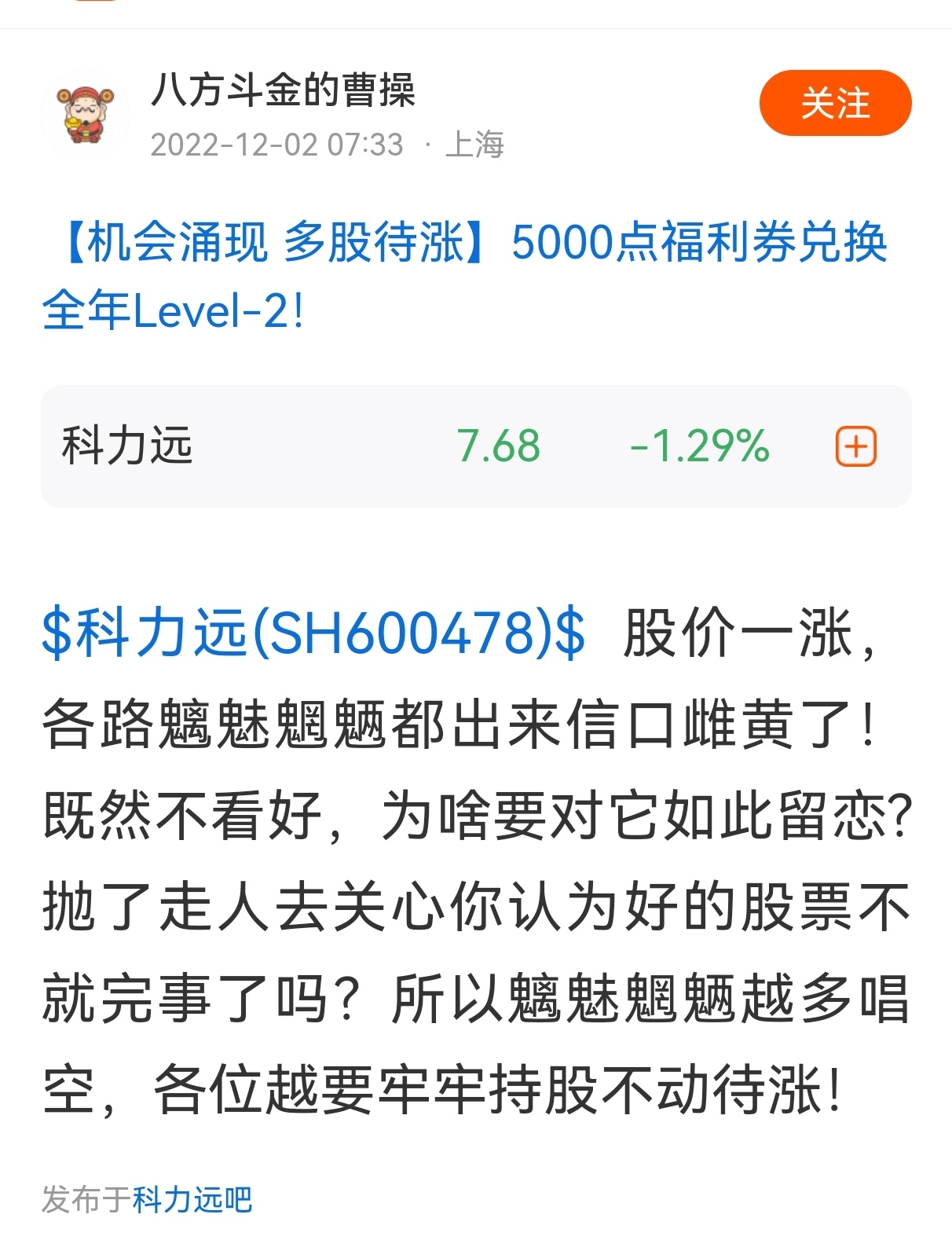 郑重声明:用户在财富号/股吧/博客等社区发表的所有信息(包括但不限于文字、视频、音频、数据及图表)仅代表个人观点,与本网站立场无关,不对您构成任何投资建议,据此操作风险自担。请勿相信代客理财、免费荐股和炒股培训等宣传内容,远离非法证券活动。请勿添加发言用户的手机号码、公众号、微博、微信及QQ等信息,谨防上当受骗!