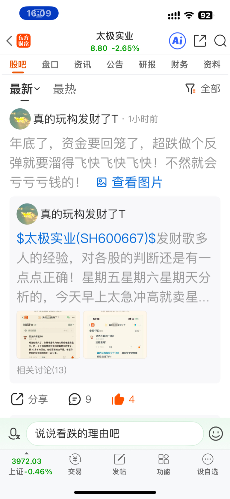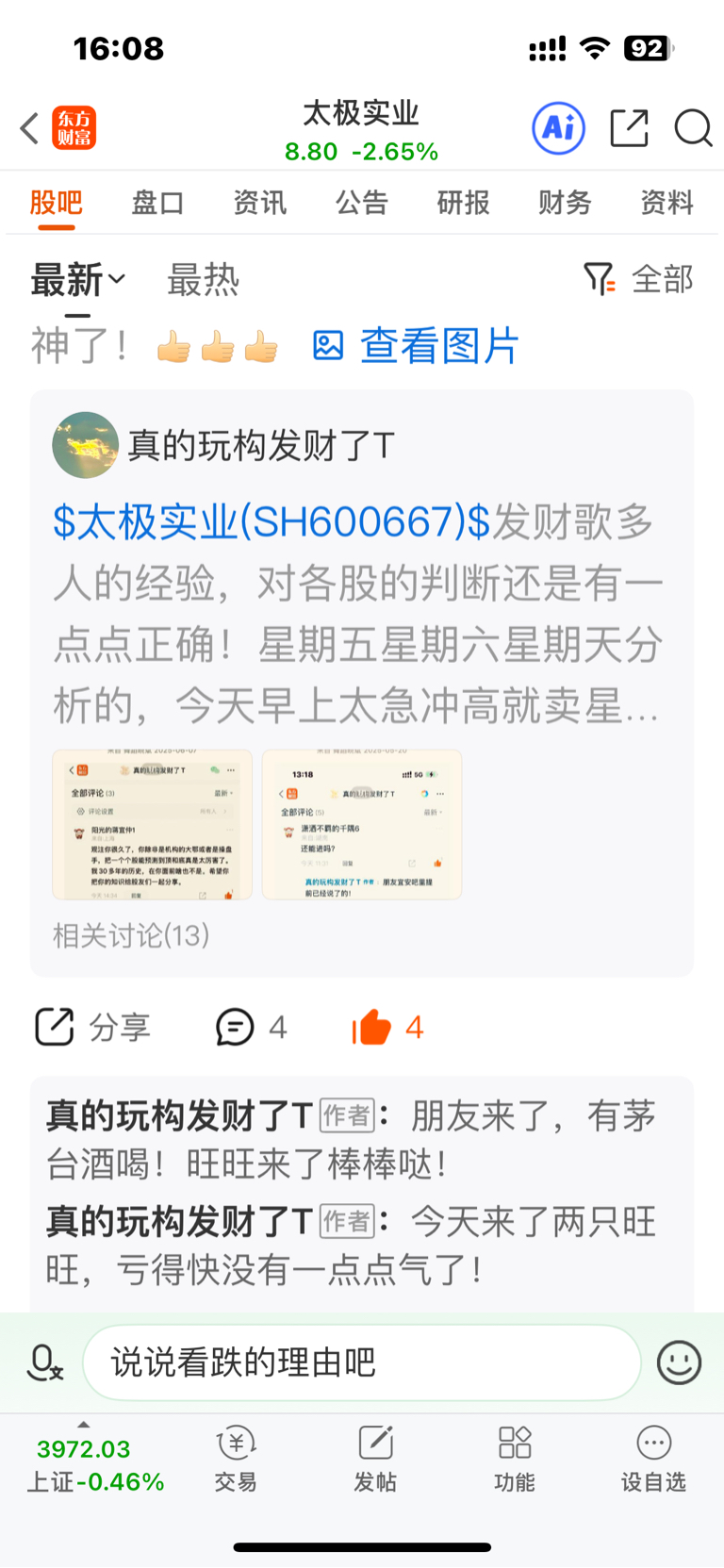$太极实业(SH600667)$ 为什么大盘听话个股听话有两个旺旺又来了不听话兄弟姐妹们赚来钱排骨还是给那两个旺旺吃!