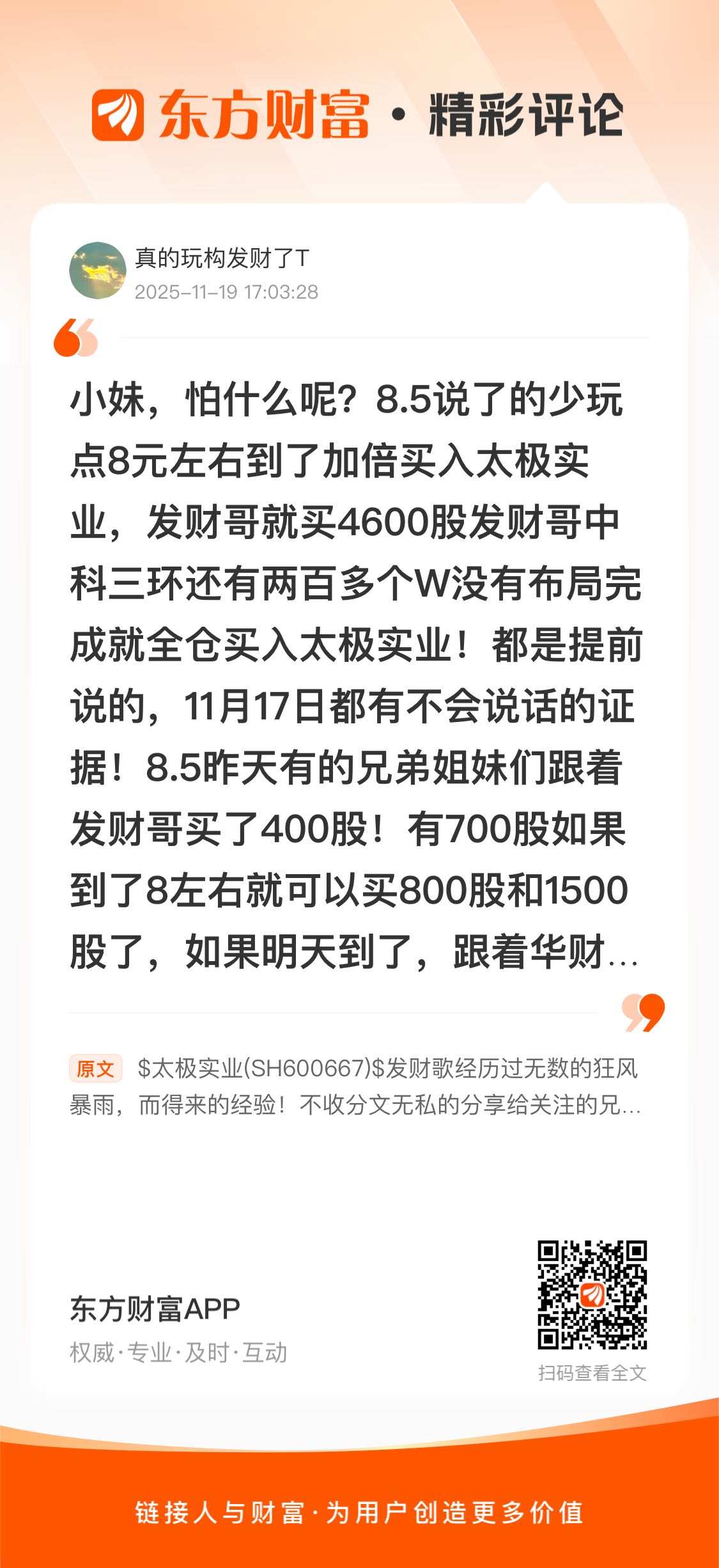 随心所愿的 小妹,怕什么呢?8.5说了的少玩点8元左右到了加倍买入太极实业,发财哥就买4600股发财哥中科三环还有两百多个W没有布局完成就全仓买入太极实业!都是提前说的,11月17日都有不会说话的证据!8.5昨天有的兄弟姐妹们跟着发财哥买了400股!有700股如果到了8左右就可以买800股和1500股了,如果明天到了,跟着华财哥一起来买入!发财哥说话算话,说一是一一言九鼎!小妹电气风电看大风车是不是让你赚到了三倍左右的利润?