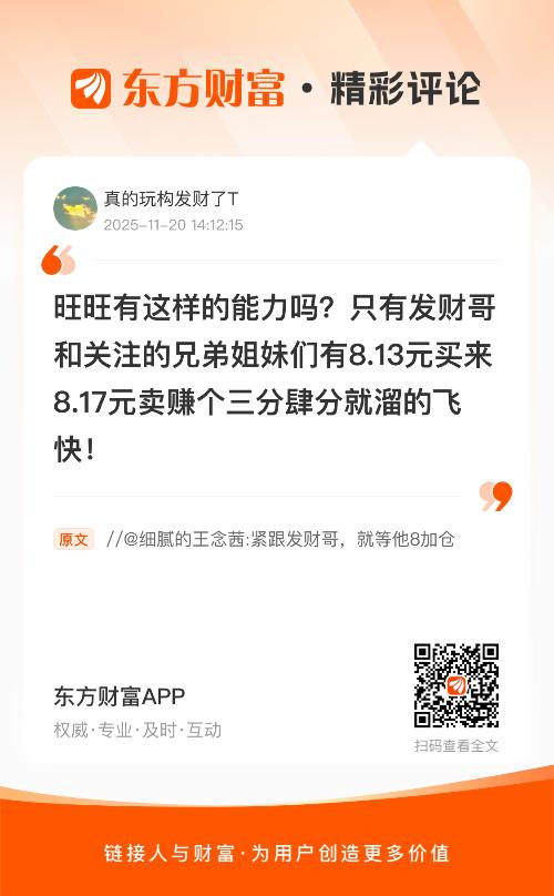 //@真的玩构发财了T :日内做T 旺旺有这样的能力吗?只有发财哥和关注的兄弟姐妹们有8.13元买来8.17元卖赚个三分肆分就溜的飞快!