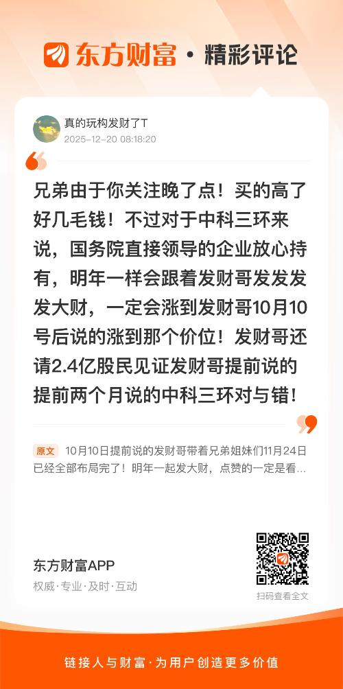 10月10日提前说的发财哥带着兄弟姐妹们11月24日已经全部布局完了!明年一起发大财,点赞的一定是看到了的,关注了的好多兄弟姐妹们跟着发财,10月10日说的中科三环什么价位?买仔细看了的都知道多少价位可以满仓干,重仓干全仓干!还说了挡到什么价位卖出最早明年等到那个价位,并且于11月24日发财歌提醒12.29可以全场满入了发财歌五百多个W干完了!等到明年实现财富自由的机会!都有不会说话的贴的证据还邀请了2.4亿股民见证发这个提前说的对与错!
