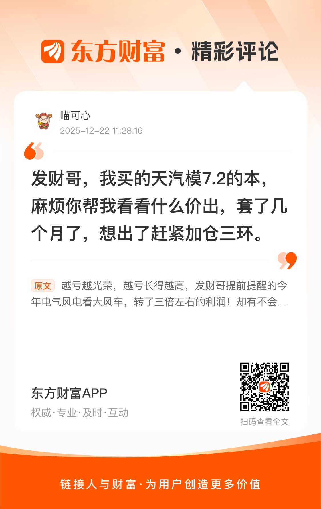兄弟前两天给你说的买高了1角左右,不然又赚钱了,//@喵可心 : 发财哥,我买的天汽模7.2的本,麻烦你帮我看看什么价出,套了几个月了,想出了赶紧加仓三环。