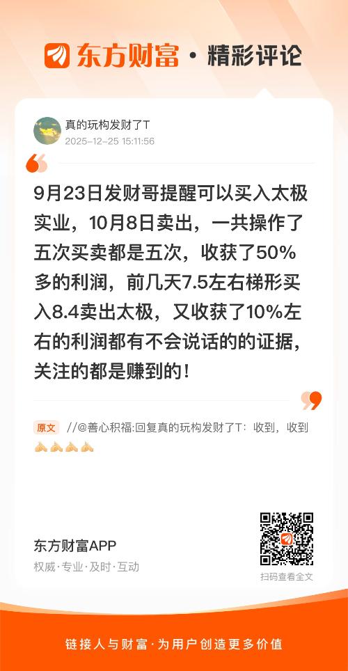 9月23日发财哥提醒可以买入太极实业,11月8日卖出,一共操作了五次买卖都是五次,收获了50%多的利润,前几天7.5左右梯形买入8.4卖出太极,又收获了10%左右的利润都有不会说话的的证据,关注的都是赚到的!