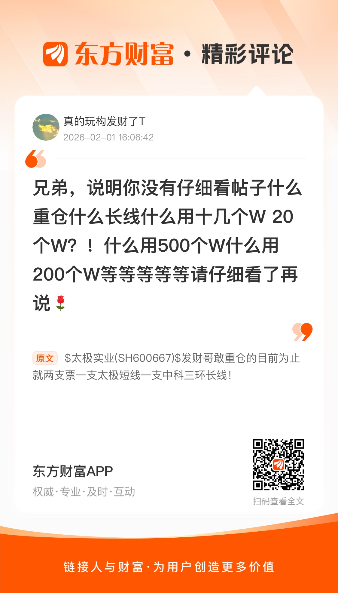 兄弟,说明你没有仔细看帖子什么重仓什么长线什么用十几个W 20个W?!什么用500个W什么用200个W等等等等等请仔细看了再说