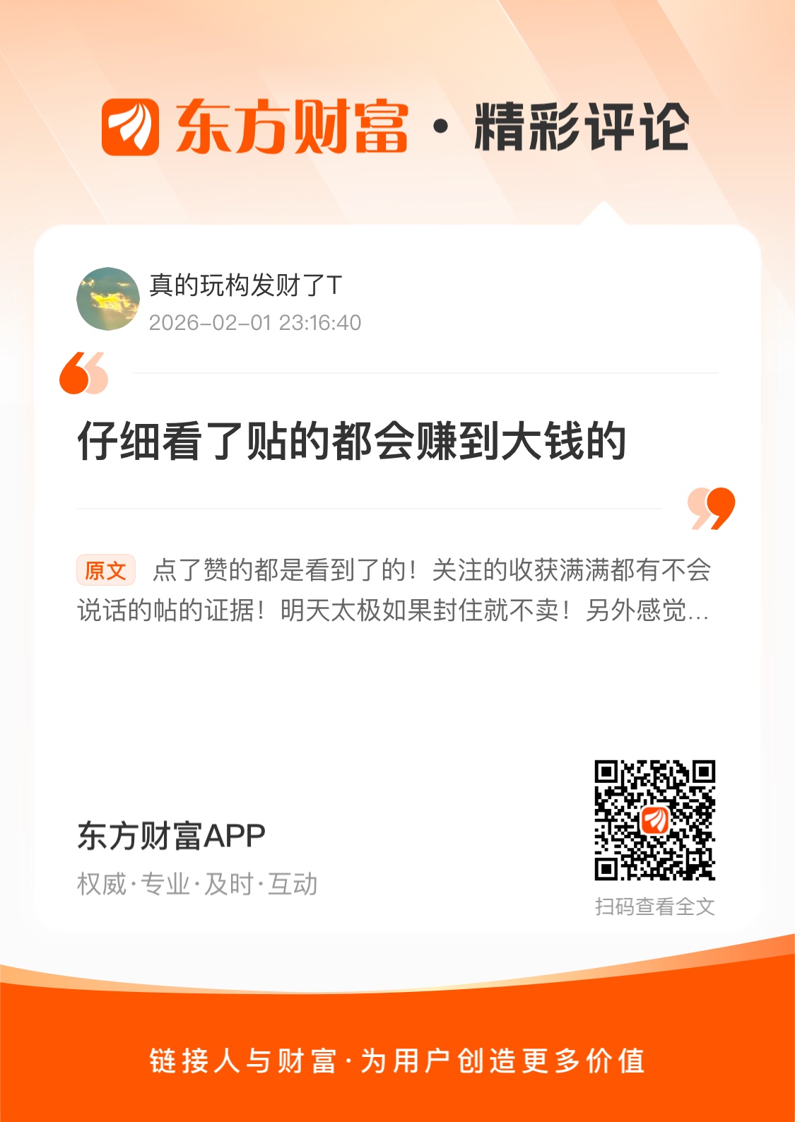 点了赞的都是看到了的!关注的收获满满都有不会说话的帖的证据!明天太极如果封住就不卖!另外感觉会高开低走仅供参考盈亏自负!
