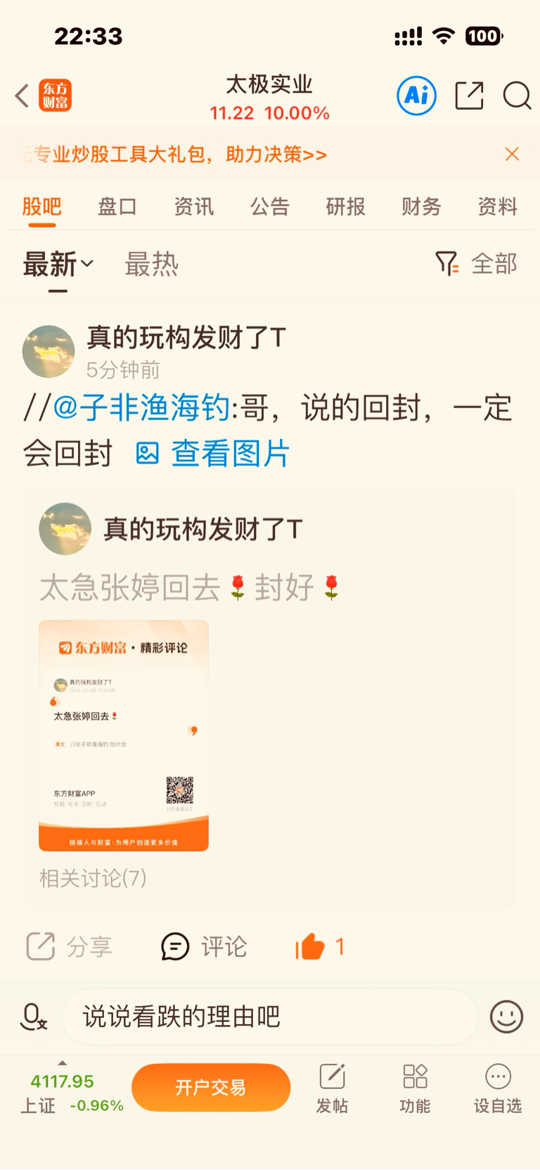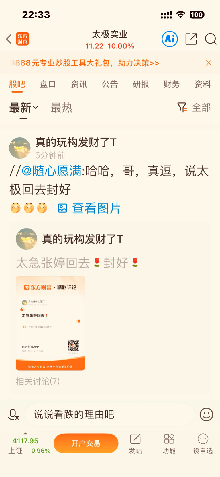 $太极实业(SH600667)$  昨天还50个W给太极庄家一下,她今明两天又要送回来给发财哥50个W左右!