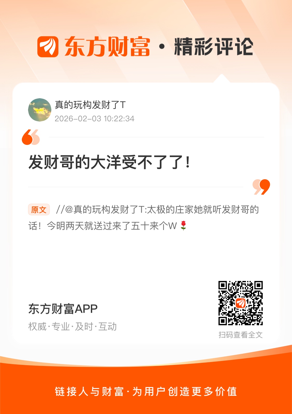 温馨提示: 1.根据《证券法》规定,禁止编造、传播虚假信息或者误导性信息,扰乱证券市场;2.用户在本社区发表的所有资料、言论等仅代表个人观点,与本网站立场无关,不对您构成任何投资建议。用户应基于自己的独立判断,自行决定证券投资并承担相应风险。《东方财富社区管理规定》