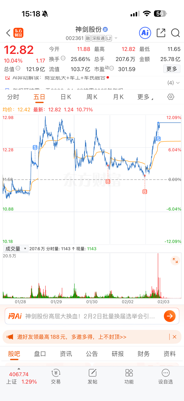 2月开门红,昨天茂业抓涨停,今天神剑住啊涨停,今天卖了茂业和神剑,入了太极实业,