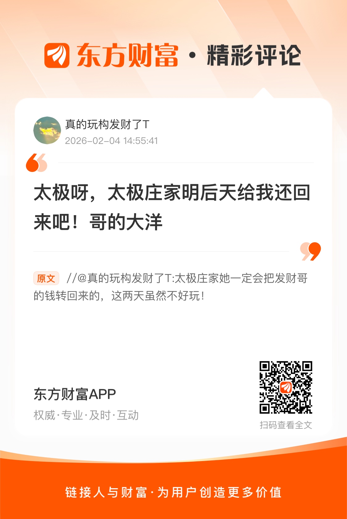 //@真的玩构发财了T : 太极庄家她一定会把发财哥的钱转回来的,这两天虽然不好玩!