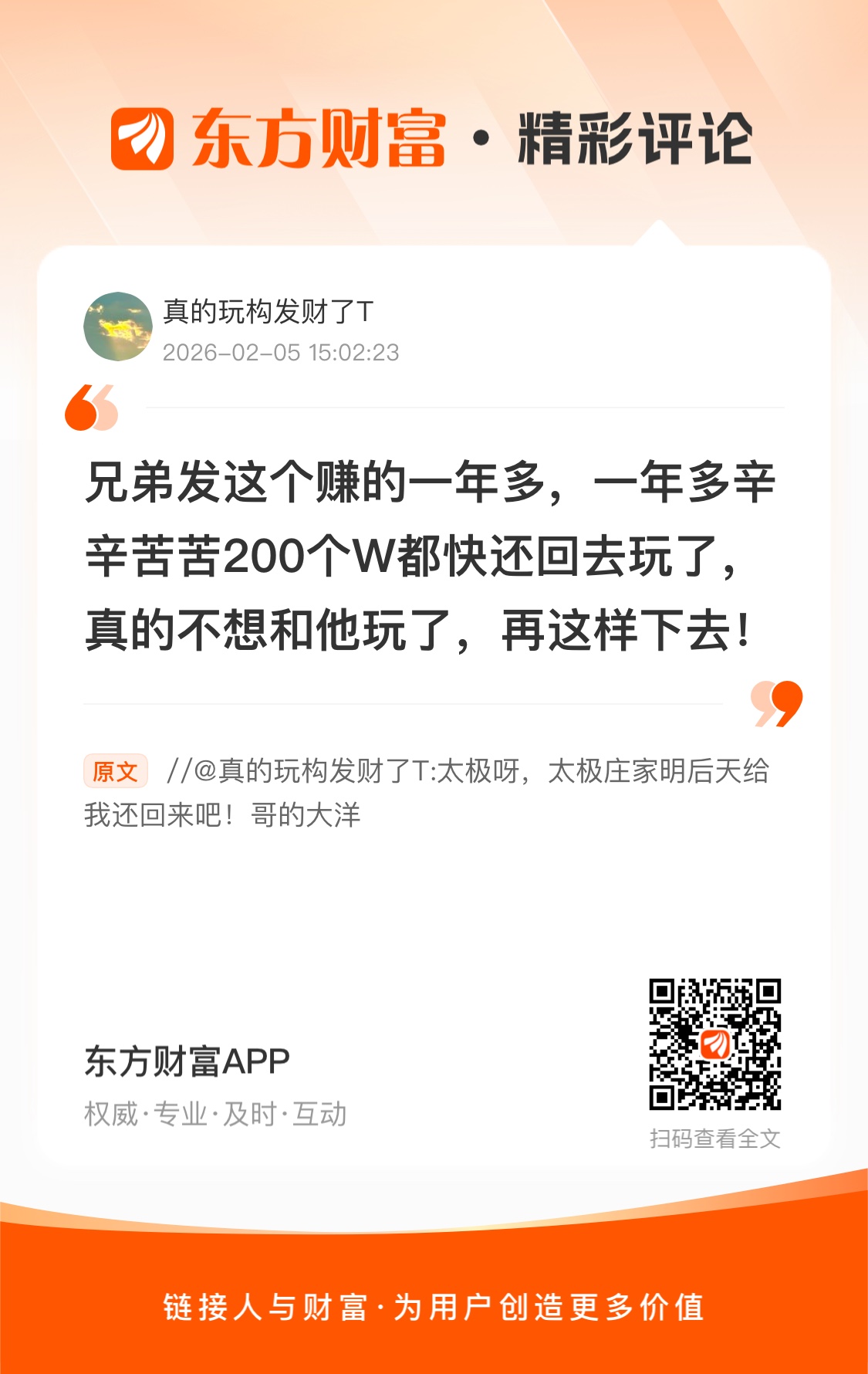 兄弟发这个赚的一年多,一年多辛辛苦苦200个W都快还回去玩了,真的不想和他玩了,再这样下去!