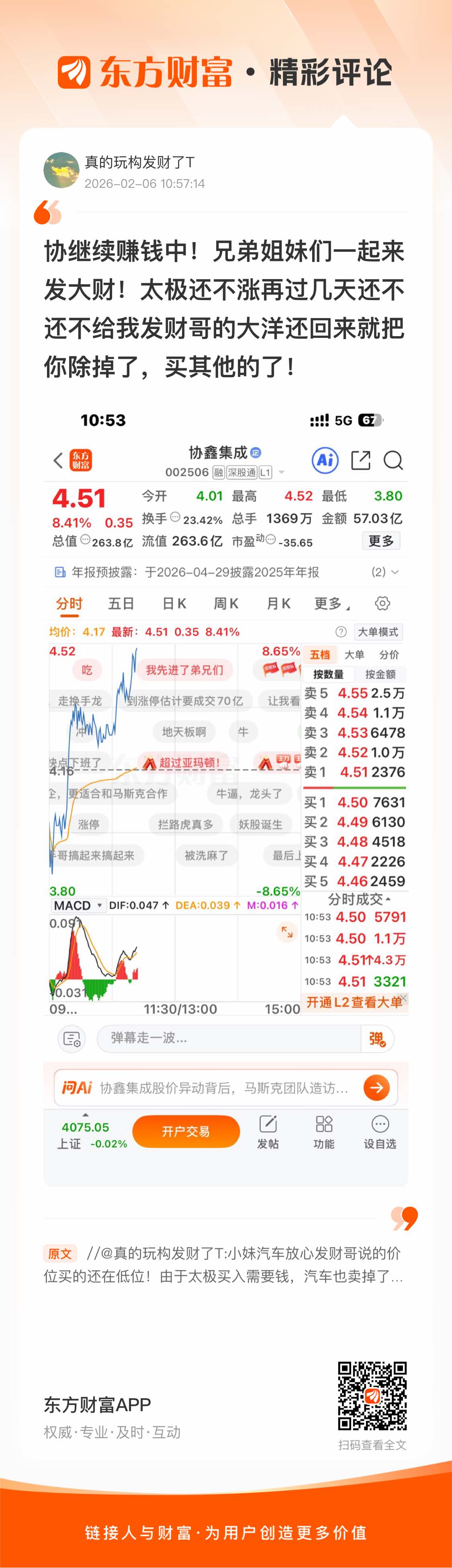 温馨提示: 1.根据《证券法》规定,禁止编造、传播虚假信息或者误导性信息,扰乱证券市场;2.用户在本社区发表的所有资料、言论等仅代表个人观点,与本网站立场无关,不对您构成任何投资建议。用户应基于自己的独立判断,自行决定证券投资并承担相应风险。《东方财富社区管理规定》