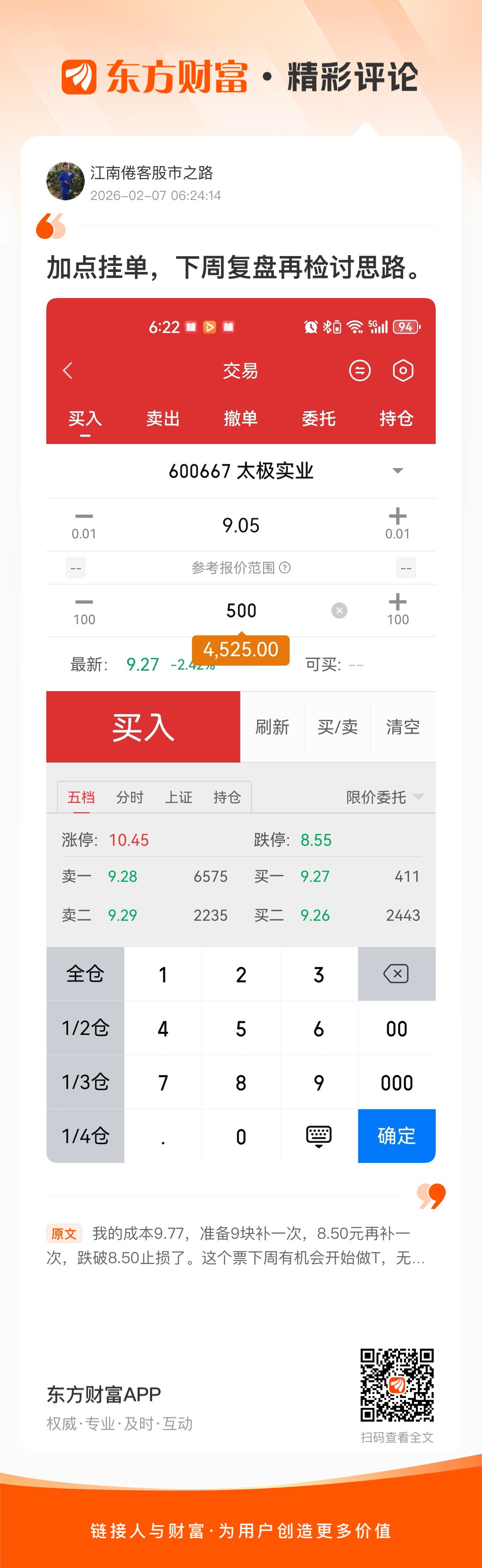我的成本9.77,准备9块补一次,8.50元再补一次,跌破8.50止损了。这个票下周有机会开始做T,无锡本土企业,支持支持,希望不要让我失望!