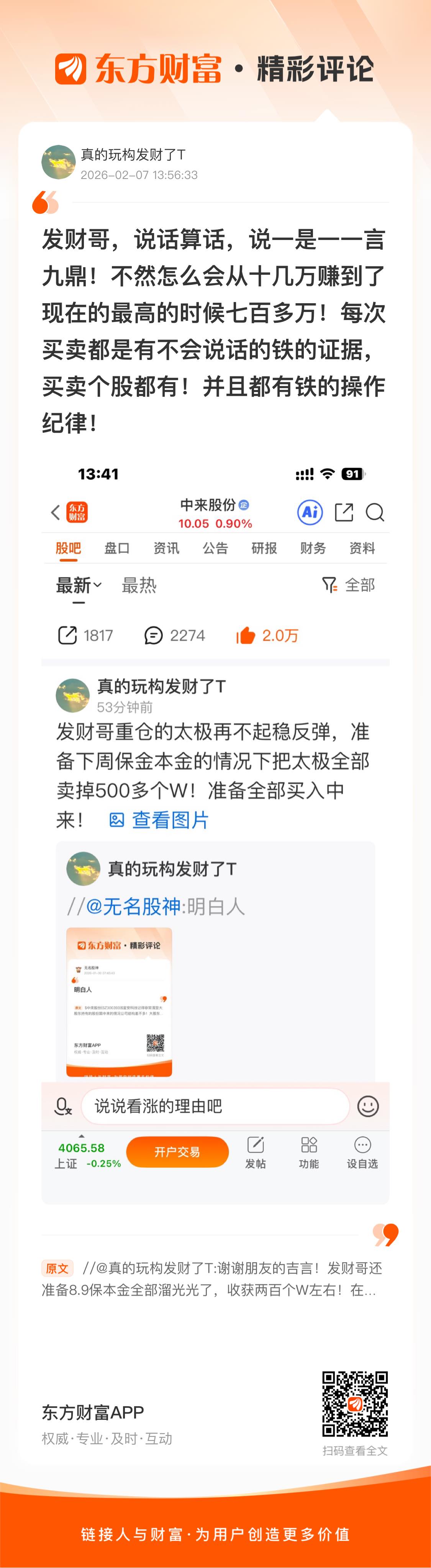 //@真的玩构发财了T : 谢谢朋友的吉言!发财哥还准备8.9保本金全部溜光光了,收获两百个W左右!在下行一点点就全部还回去了太急!如果真的涨停就又不卖了,又可以实现八位数的目标了!