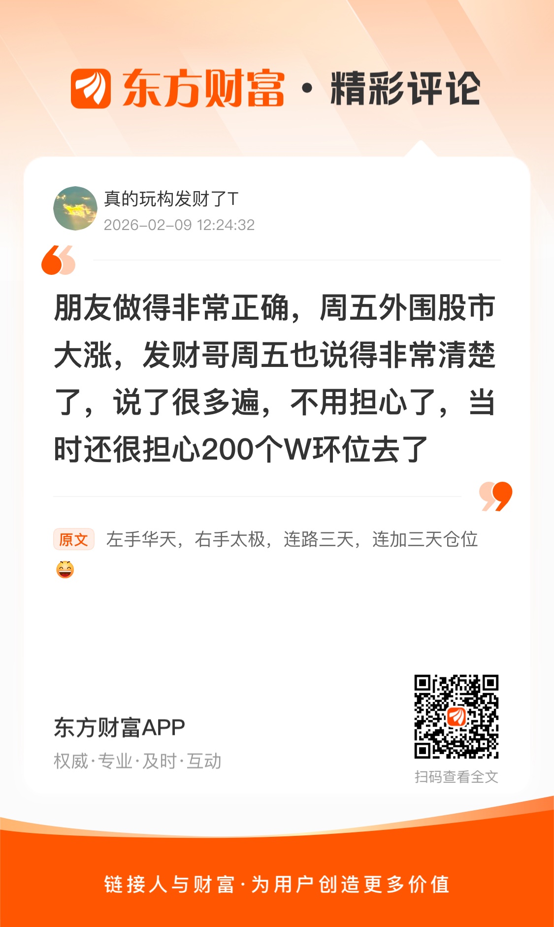 //@真的玩构发财了T : 朋友做得非常正确,周五外围股市大涨,发财哥周五也说得非常清楚了,说了很多遍,不用担心了,当时还很担心200个W环位去了