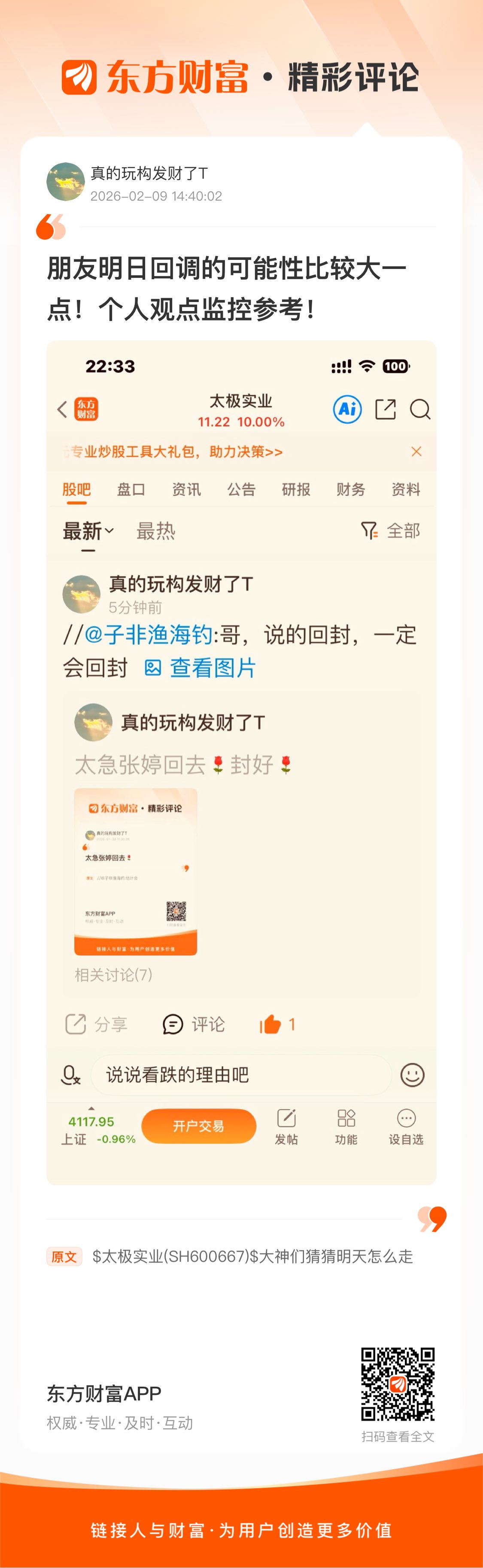 温馨提示: 1.根据《证券法》规定,禁止编造、传播虚假信息或者误导性信息,扰乱证券市场;2.用户在本社区发表的所有资料、言论等仅代表个人观点,与本网站立场无关,不对您构成任何投资建议。用户应基于自己的独立判断,自行决定证券投资并承担相应风险。《东方财富社区管理规定》