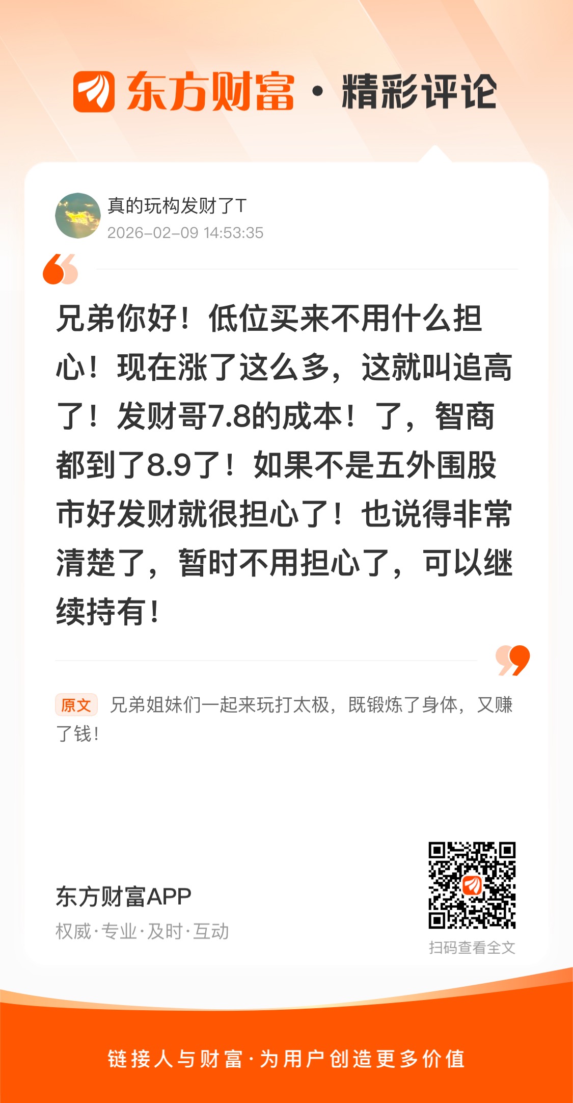 //@真的玩构发财了T : 兄弟你好!低位买来不用什么担心!现在涨了这么多,这就叫追高了!发财哥7.8的成本!了,智商都到了8.9了!如果不是五外围股市好发财就很担心了!也说得非常清楚了,暂时不用担心了,可以继续持有!
