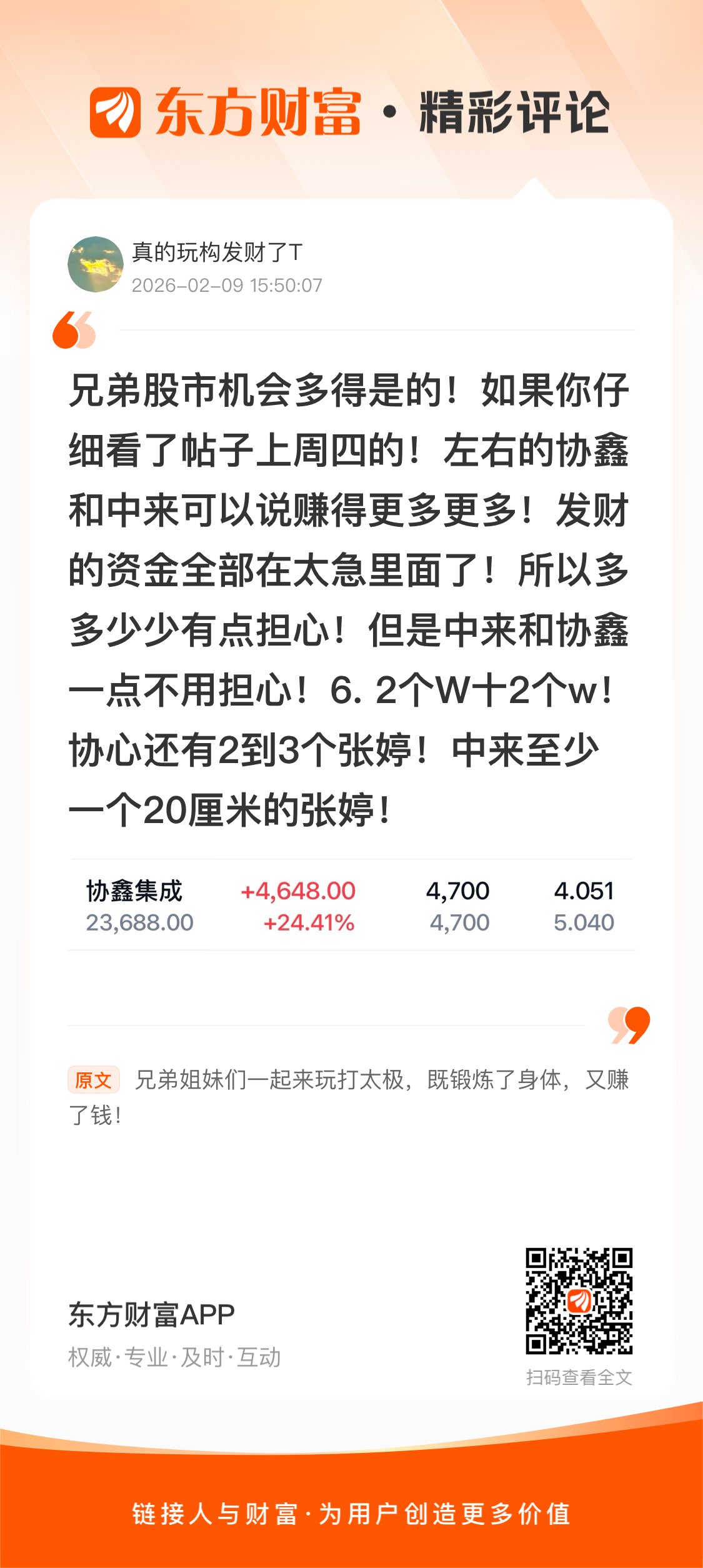 //@真的玩构发财了T : 兄弟股市机会多得是的!如果你仔细看了帖子上周四的!左右的协鑫和中来可以说赚得更多更多!发财的资金全部在太急里面了!所以多多少少有点担心!但是中来和协鑫一点不用担心!6. 2个W十2个w!协心还有2到3个张婷!中来至少一个20厘米的张婷!