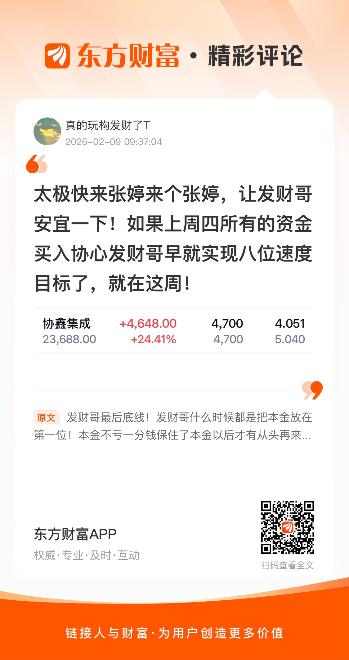 温馨提示: 1.根据《证券法》规定,禁止编造、传播虚假信息或者误导性信息,扰乱证券市场;2.用户在本社区发表的所有资料、言论等仅代表个人观点,与本网站立场无关,不对您构成任何投资建议。用户应基于自己的独立判断,自行决定证券投资并承担相应风险。《东方财富社区管理规定》