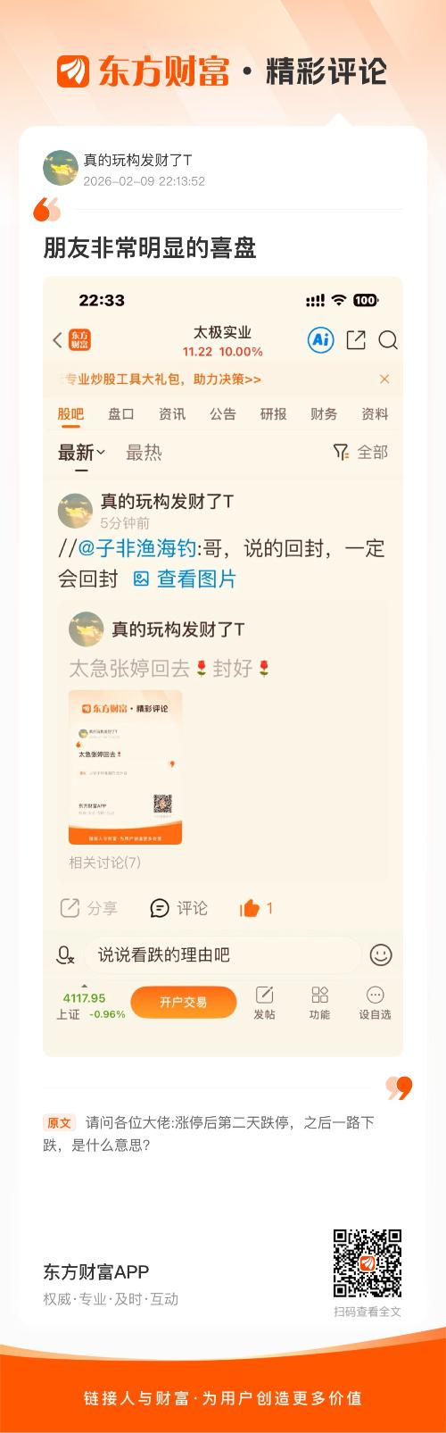 温馨提示: 1.根据《证券法》规定,禁止编造、传播虚假信息或者误导性信息,扰乱证券市场;2.用户在本社区发表的所有资料、言论等仅代表个人观点,与本网站立场无关,不对您构成任何投资建议。用户应基于自己的独立判断,自行决定证券投资并承担相应风险。《东方财富社区管理规定》