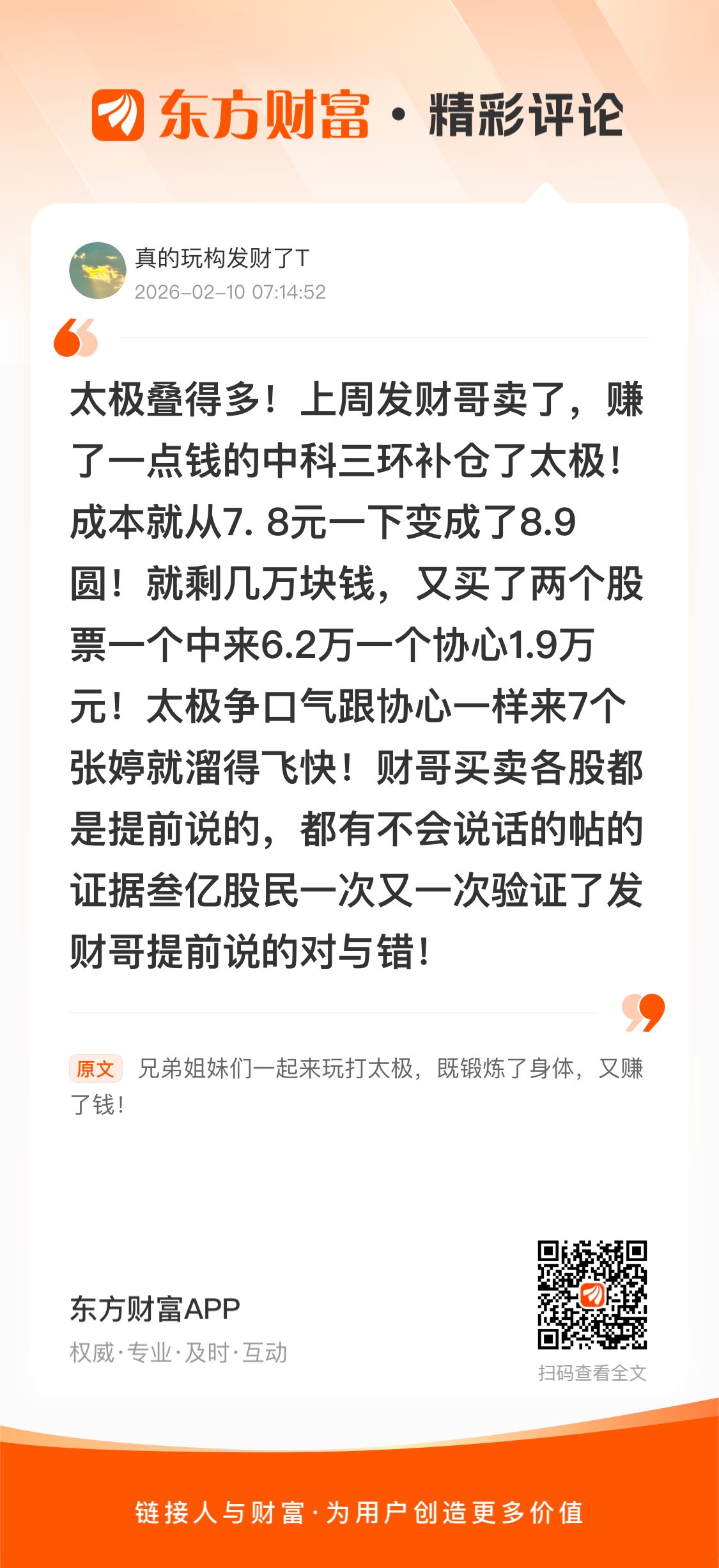 太极叠得多!上周发财哥卖了,赚了一点钱的中科三环补仓了太极!成本就从7. 8元一下变成了8.9圆!就剩几万块钱,又买了两个股票一个中来6.2万一个协心1.9万元!太极争口气跟协心一样来7个张婷就溜得飞快!财哥买卖各股都是提前说的,都有不会说话的帖的证据叁亿股民一次又一次验证了发财哥提前说的对与错!