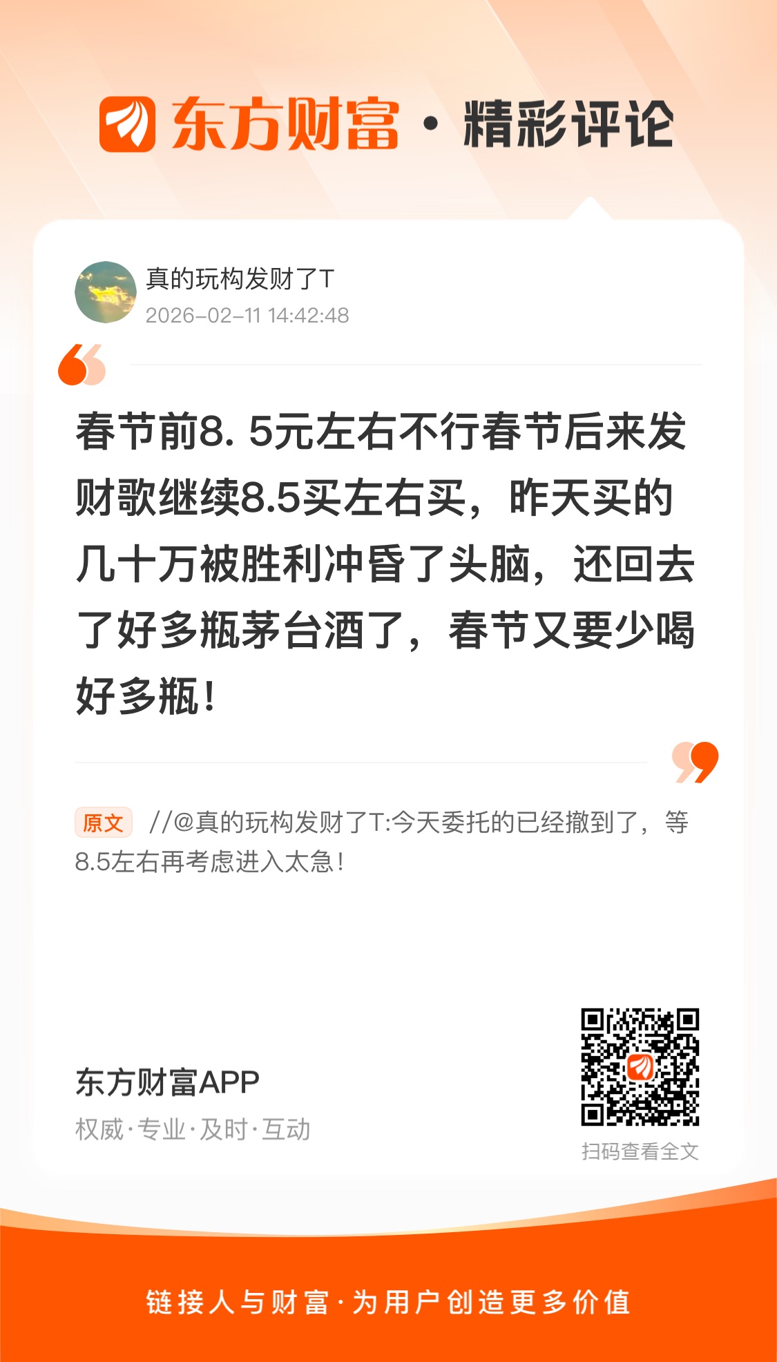 //@真的玩构发财了T : 春节前8. 5元左右不行春节后来发财歌继续8.5买左右买,昨天买的几十万被胜利冲昏了头脑,还回去了好多瓶茅台酒了,春节又要少喝好多瓶!