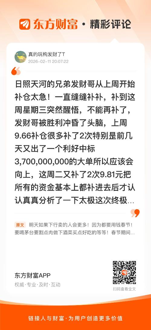 //@真的玩构发财了T :回复 日照天河的兄弟发财哥从上周开始补仓太急!一直缝缝补补,补到这周星期三突然醒悟,不能再补了,发财哥被胜利冲昏了头脑,上周9.66补仓很多补了2次特别昰前几天又出了一个利好中标3,700,000,000的大单所以应该会向上,这周二又补了2次9.81元把所有的资金基本上都补进去后才认认真真分析了一下太极这次终极目标应该在8.5左右!