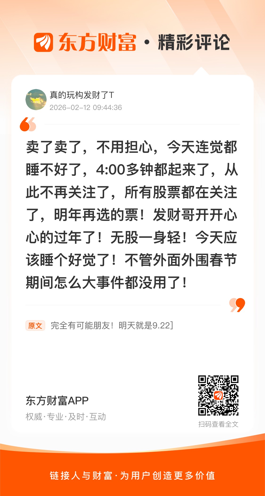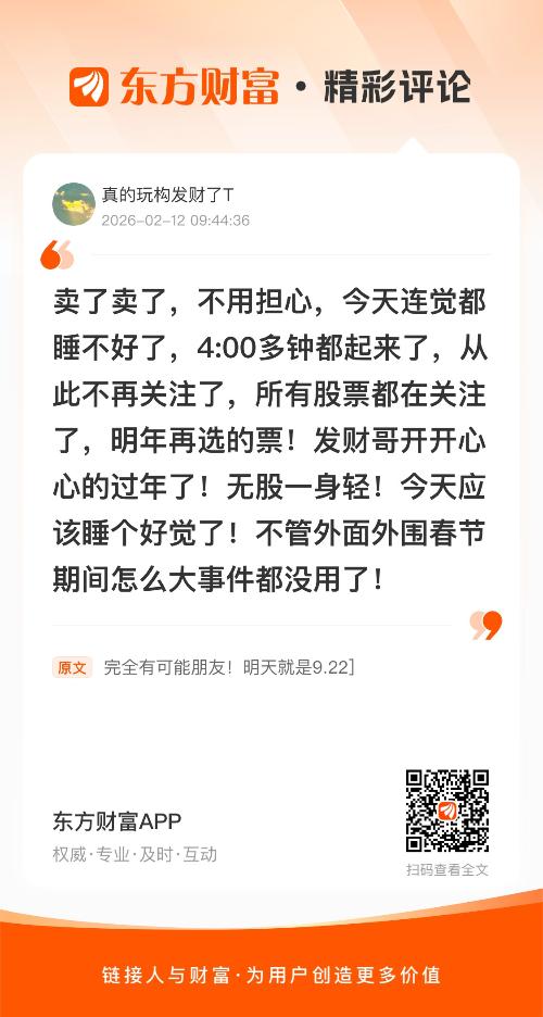 //@真的玩构发财了T : 卖了卖了,不用担心,今天连觉都睡不好了,4:00多钟都起来了,从此不再关注了,所有股票都在关注了,明年再选的票!发财哥开开心心的过年了!无股一身轻!今天应该睡个好觉了!不管外面外围春节期间怎么大事件都没用了!