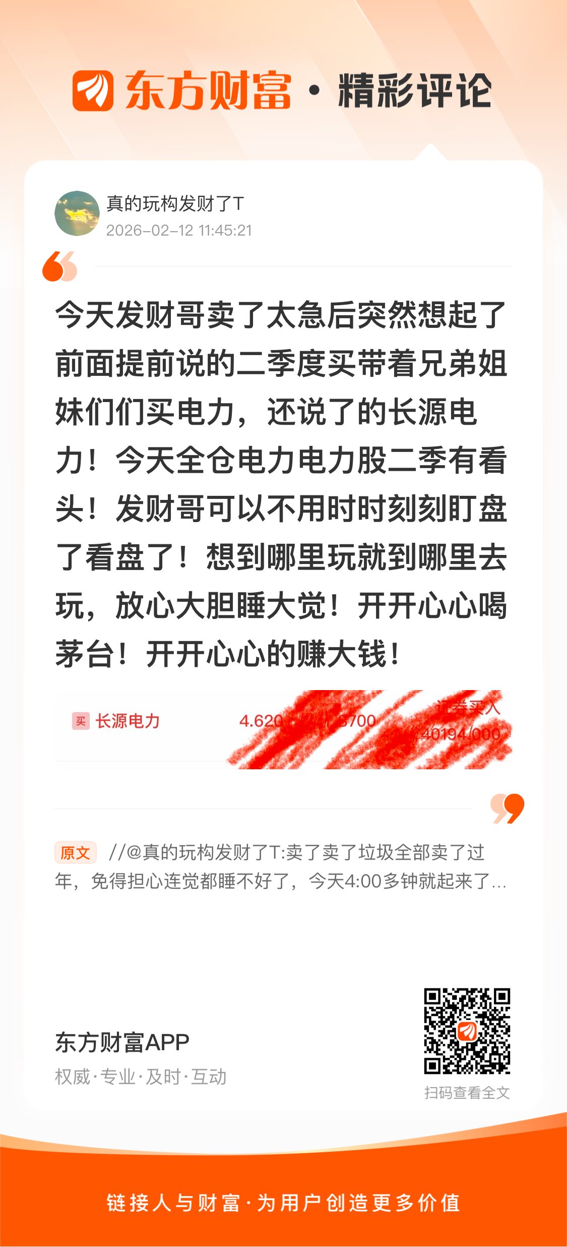 点了赞的都是看到了的,关注了的,春节过了很快就是二季度了,兄弟姐妹们逢低可以买入! 今天发财哥卖了太急后突然想起了前面提前说的二季度买带着兄弟姐妹们们买电力,还说了的长源电力!今天全仓电力电力股二季有看头!发财哥可以不用时时刻刻盯盘了看盘了!想到哪里玩就到哪里去玩,放心大胆睡大觉!开开心心喝茅台!开开心心的赚大钱!