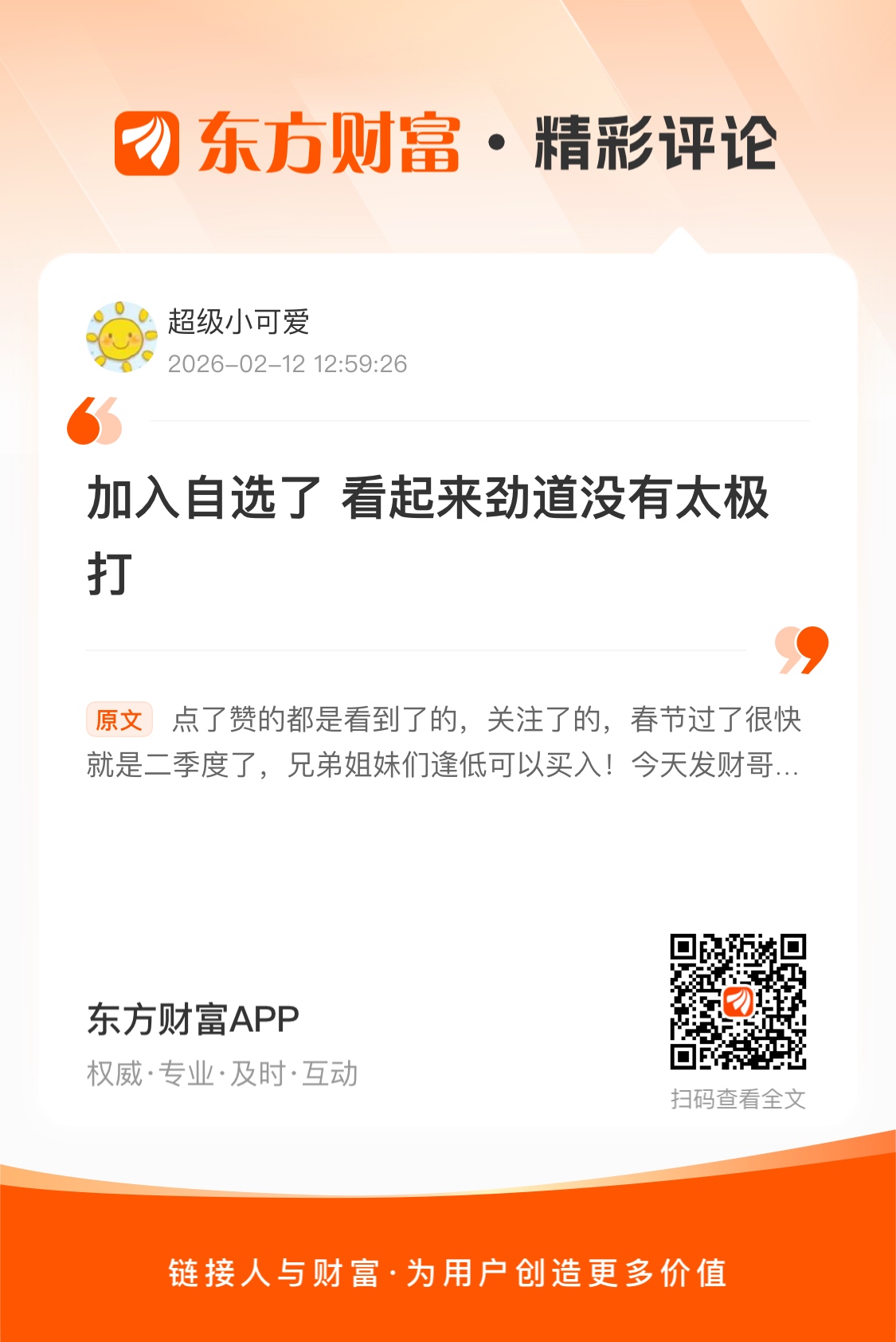 温馨提示: 1.根据《证券法》规定,禁止编造、传播虚假信息或者误导性信息,扰乱证券市场;2.用户在本社区发表的所有资料、言论等仅代表个人观点,与本网站立场无关,不对您构成任何投资建议。用户应基于自己的独立判断,自行决定证券投资并承担相应风险。《东方财富社区管理规定》
