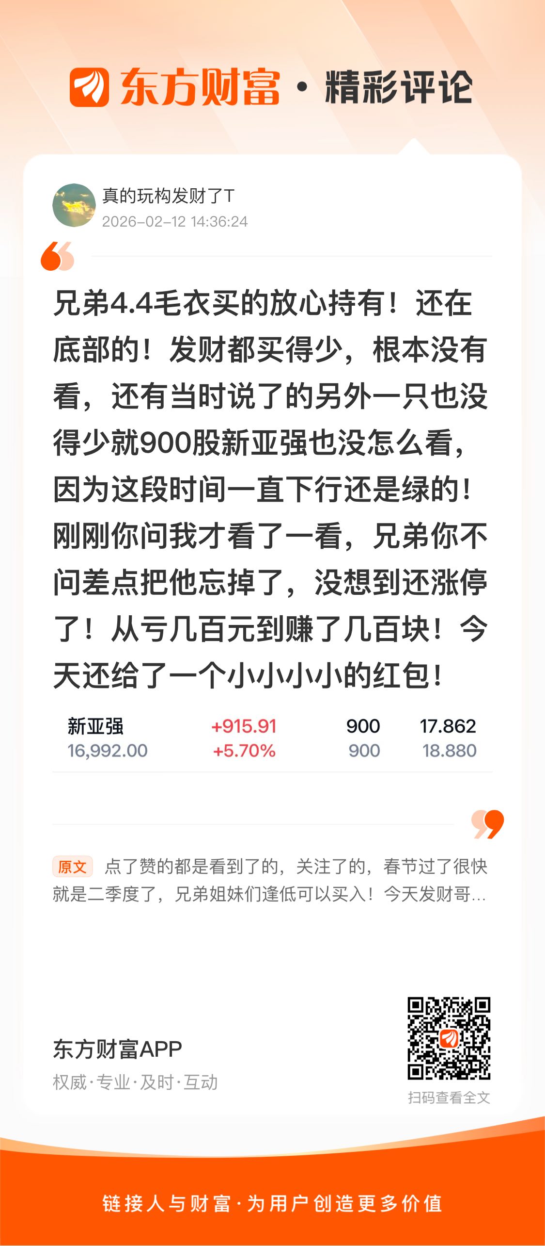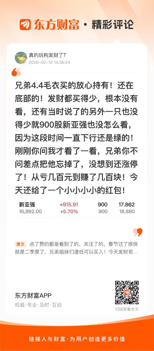 //@真的玩构发财了T : 兄弟4.4毛衣买的放心持有!还在底部的!发财都买得少,根本没有看,还有当时说了的另外一只也没得少就900股新亚强也没怎么看,因为这段时间一直下行还是绿的!刚刚你问我才看了一看,兄弟你不问差点把他忘掉了,没想到还涨停了!从亏几百元到赚了几百块!今天还给了一个小小小小的红包!