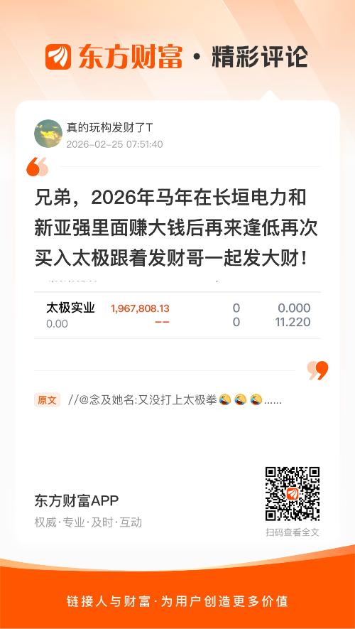 //@真的玩构发财了T : 兄弟,2026年马年在长垣电力和新亚强里面赚大钱后再来逢低再次买入太极跟着发财哥一起发大财!