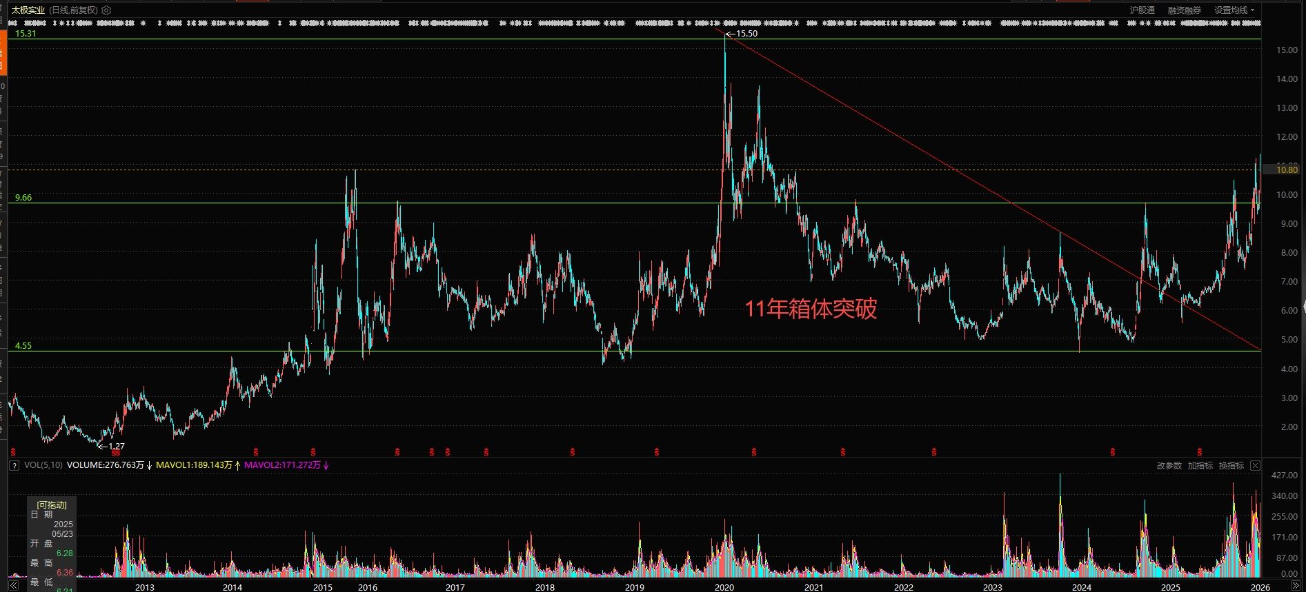 $太极实业(SH600667)$ 突破11年箱体,我们认为,是有机会摸前高的