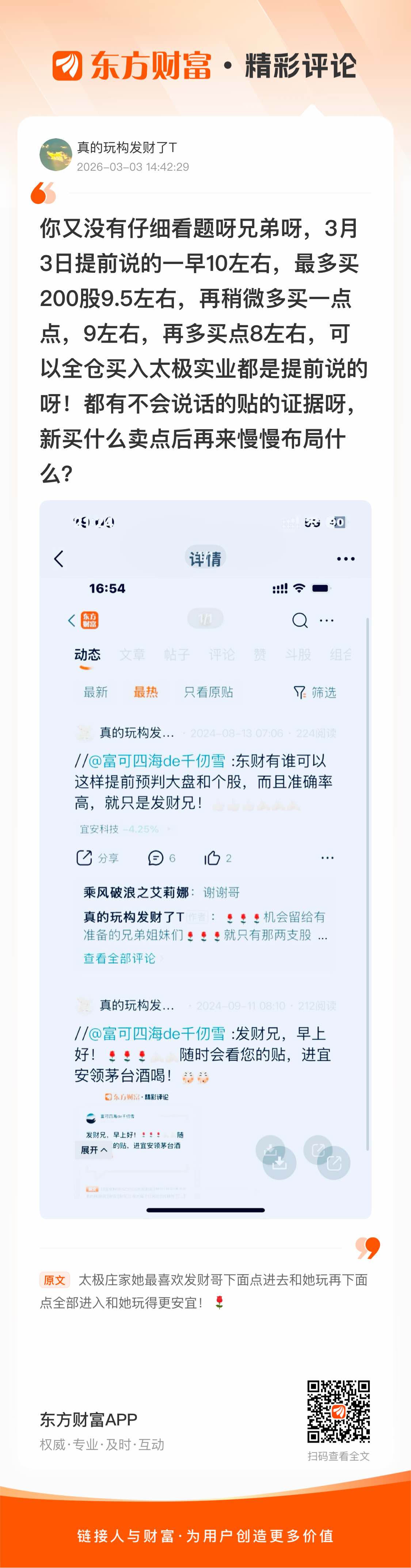 //@真的玩构发财了T : 回复 顾大局地东方不败 :你又没有仔细看题呀兄弟呀,3月3日提前说的一早10左右,最多买200股9.5左右,再稍微多买一点点,9左右,再多买点8左右,可以全仓买入太极实业都是提前说的呀!都有不会说话的贴的证据呀,新买什么卖点后再来慢慢布局什么?