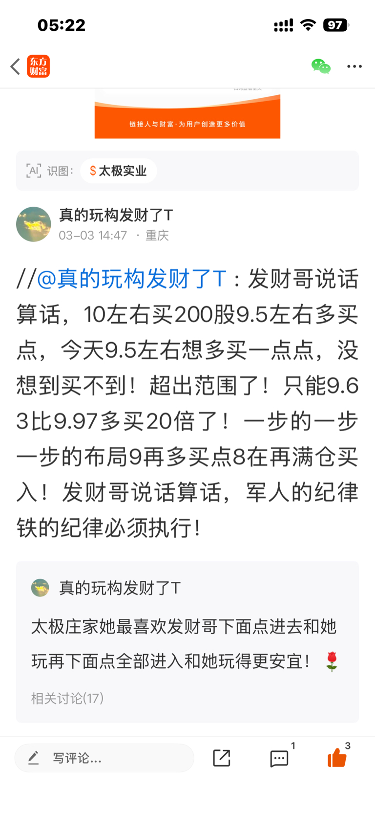 $太极实业(SH600667)$ 发财哥昨天清仓了所有的票!并且把所有的资金全部转到银行了!怕管不住手,就留了昨天一早提前说的怎么样操作布局买入太极失业说话算话10元左右先买200股今天一早己经委托了4200股!到了9元再转300个W左右买入太极!到了8左右再转600个W左右满仓全仓太极!发财哥马年带着关注的能赚到多少个W 3月3日一早提先提醒的!都有不会说话的贴的证据,军人必须实行说过的话!军人必须遵守铁的纪律