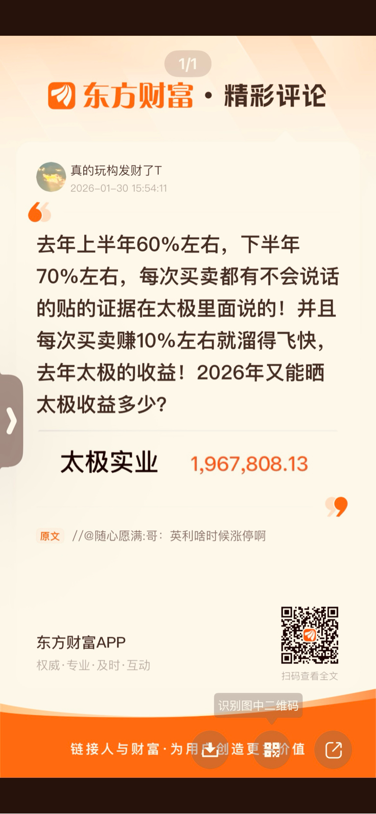 温馨提示: 1.根据《证券法》规定,禁止编造、传播虚假信息或者误导性信息,扰乱证券市场;2.用户在本社区发表的所有资料、言论等仅代表个人观点,与本网站立场无关,不对您构成任何投资建议。用户应基于自己的独立判断,自行决定证券投资并承担相应风险。《东方财富社区管理规定》