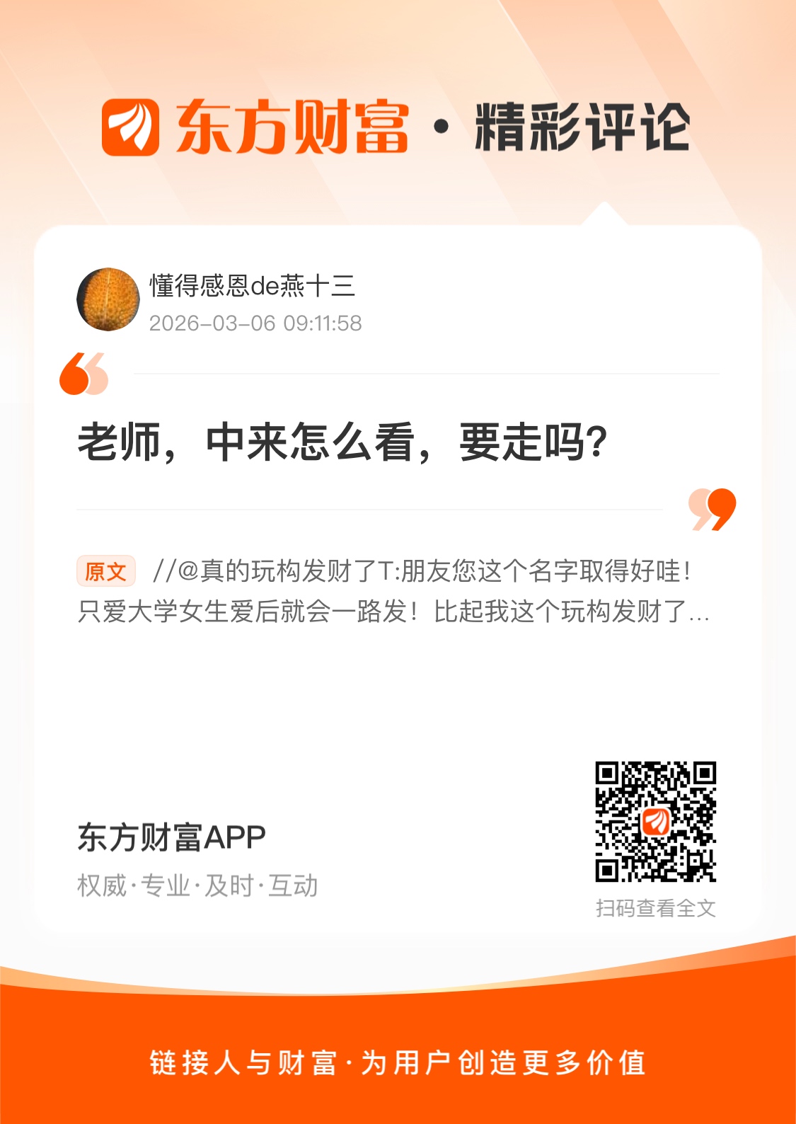 温馨提示: 1.根据《证券法》规定,禁止编造、传播虚假信息或者误导性信息,扰乱证券市场;2.用户在本社区发表的所有资料、言论等仅代表个人观点,与本网站立场无关,不对您构成任何投资建议。用户应基于自己的独立判断,自行决定证券投资并承担相应风险。《东方财富社区管理规定》