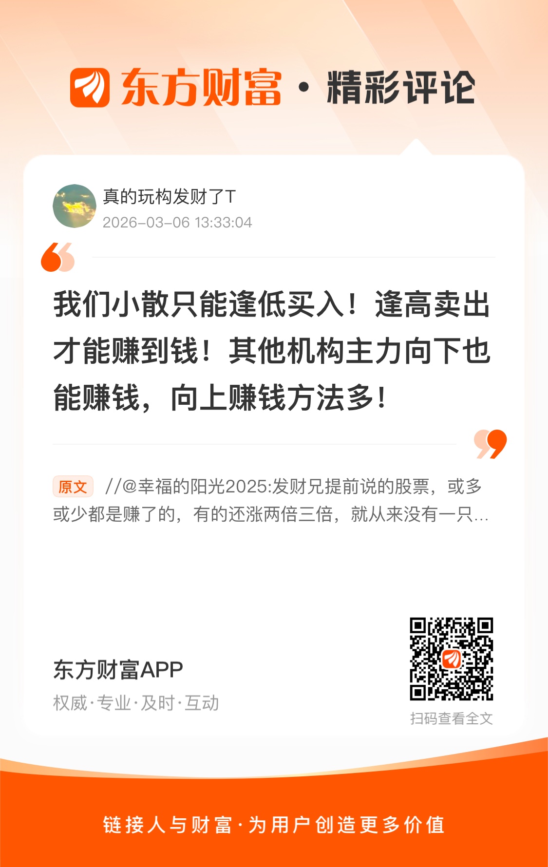 温馨提示: 1.根据《证券法》规定,禁止编造、传播虚假信息或者误导性信息,扰乱证券市场;2.用户在本社区发表的所有资料、言论等仅代表个人观点,与本网站立场无关,不对您构成任何投资建议。用户应基于自己的独立判断,自行决定证券投资并承担相应风险。《东方财富社区管理规定》