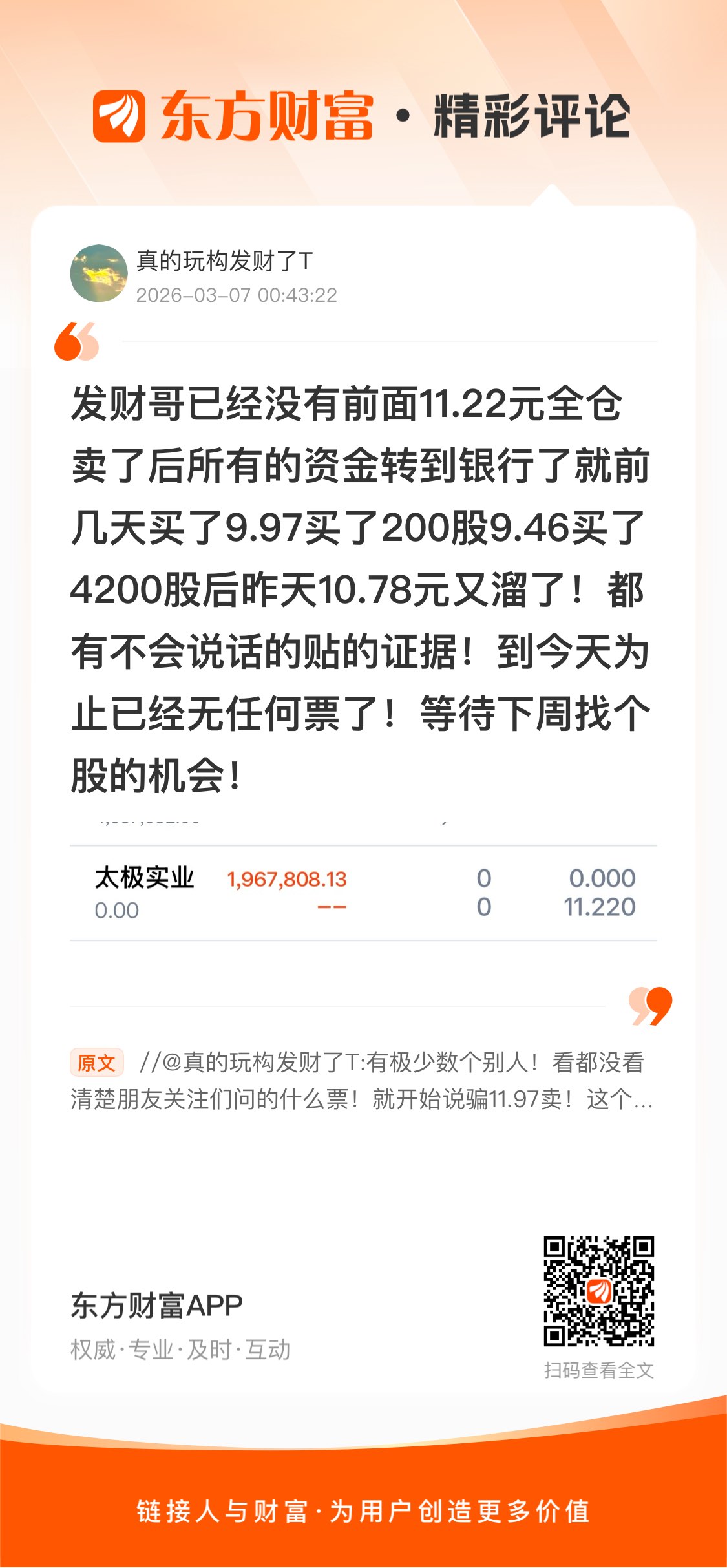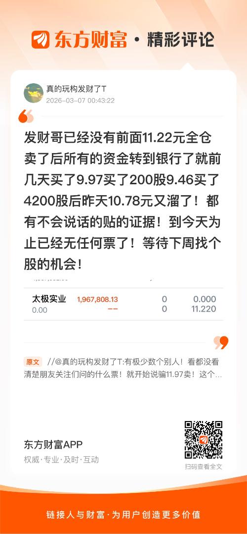 //@真的玩构发财了T : 有极少数个别人!看都没看清楚朋友关注们问的什么票!就开始说骗11.97卖!这个价位没到!真的是服了极少数个人!发财哥11.97卖的还说那位兄弟在问我说今天他可能还可以多赚一点,比帅哥稍微高一点!已经全部卖掉了,9.5左右又买入了太极,昨天10.78远又溜了!都有不会说话的铁的证据
