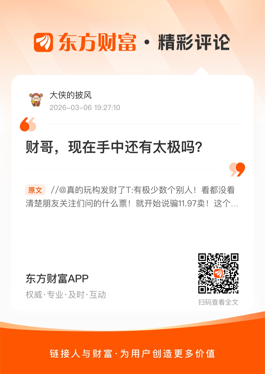//@真的玩构发财了T : 有极少数个别人!看都没看清楚朋友关注们问的什么票!就开始说骗11.97卖!这个价位没到!真的是服了极少数个人!发财哥11.97卖的还说那位兄弟在问我说今天他可能还可以多赚一点,比帅哥稍微高一点!已经全部卖掉了,9.5左右又买入了太极,昨天10.78远又溜了!都有不会说话的铁的证据