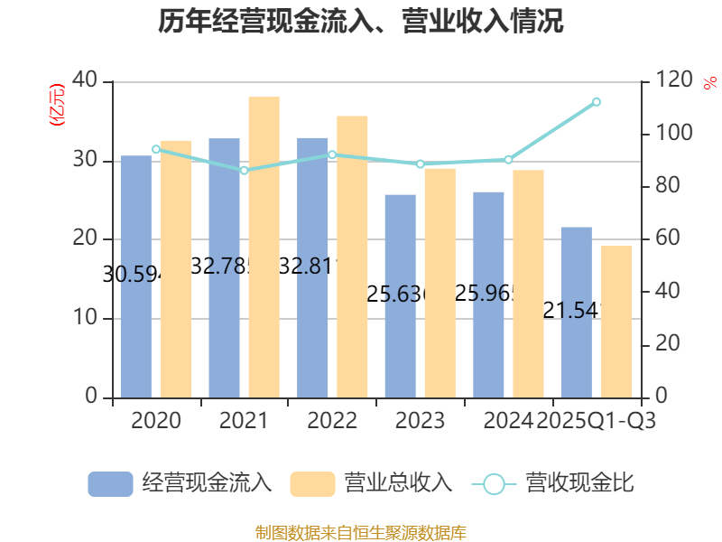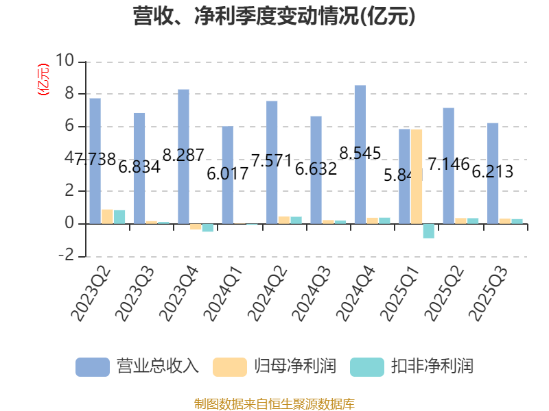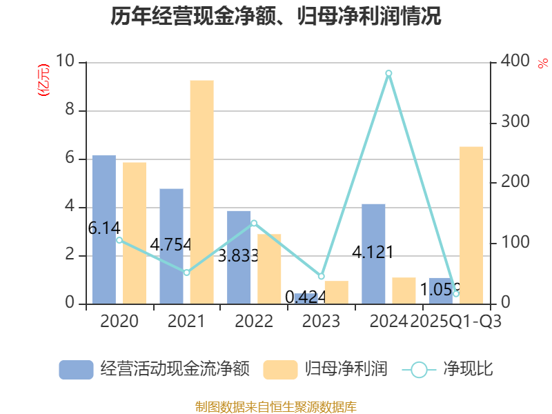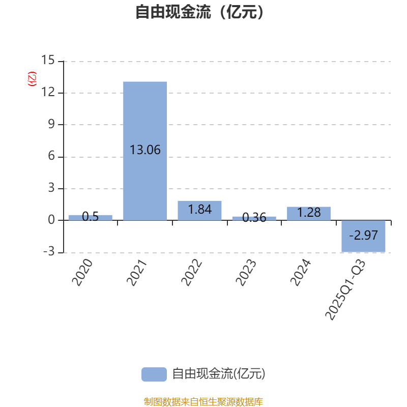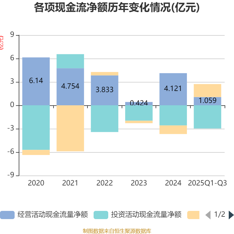 2025年前三季度,公司经营活动现金流净额为1.06亿元,同比下降27.69%;筹资活动现金流净额1.67亿元,同比增加2.12亿元;投资活动现金流净额-2.97亿元,上年同期为-6802.48万元。